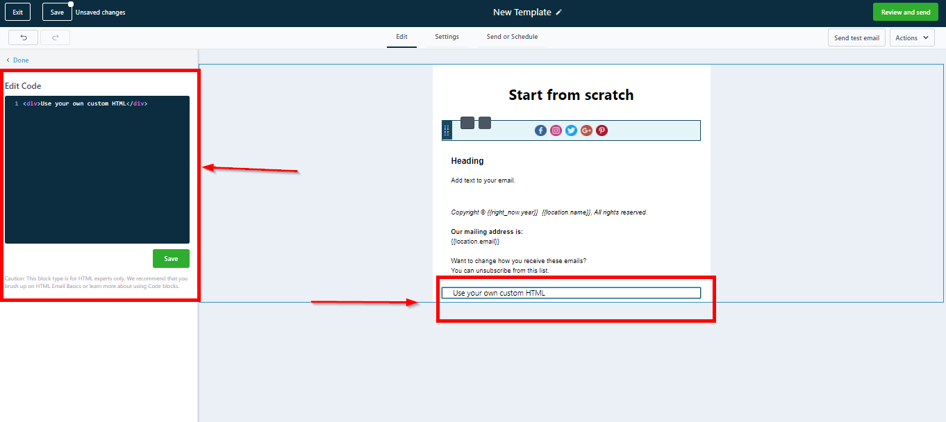 To write the custom code, you can use this HTML editor on the top left of your CRM as shown below.