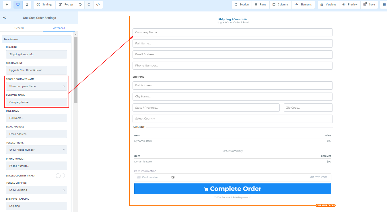 You can decide to show a form field for the “Company name” or you can hide it.
