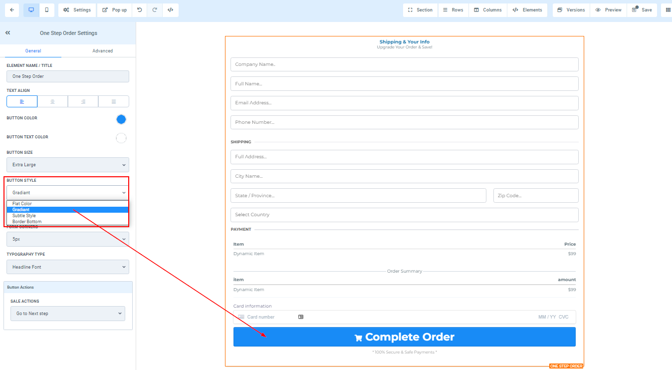 If you want to change the button color of your order form, you can do that by clicking on the color you want to change it to.