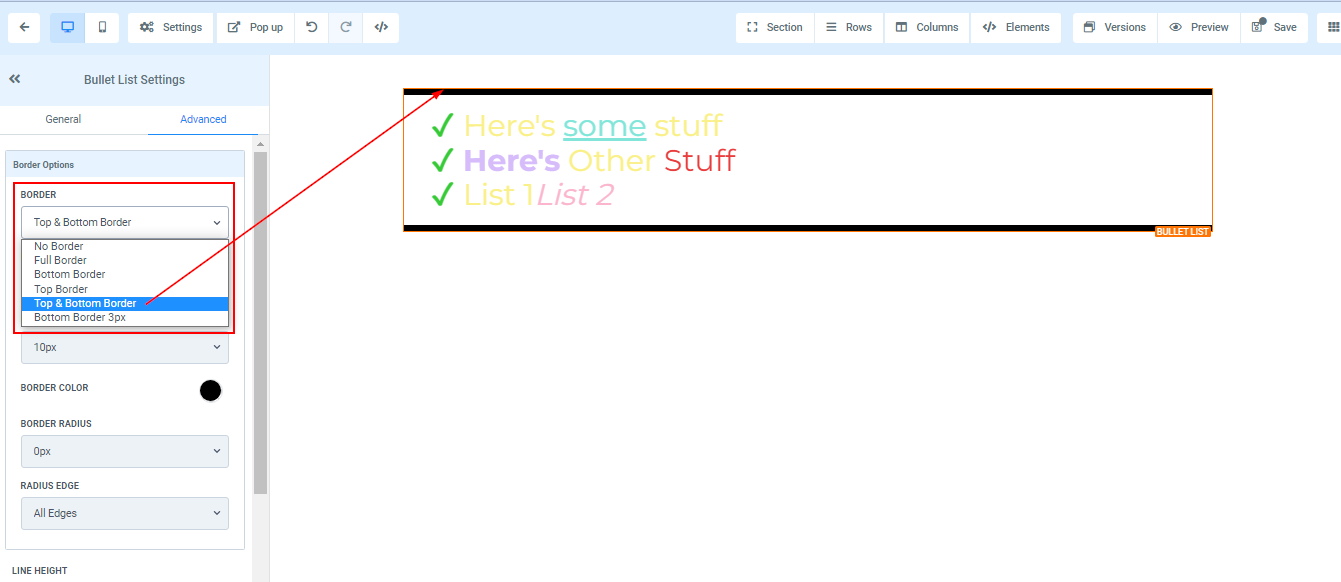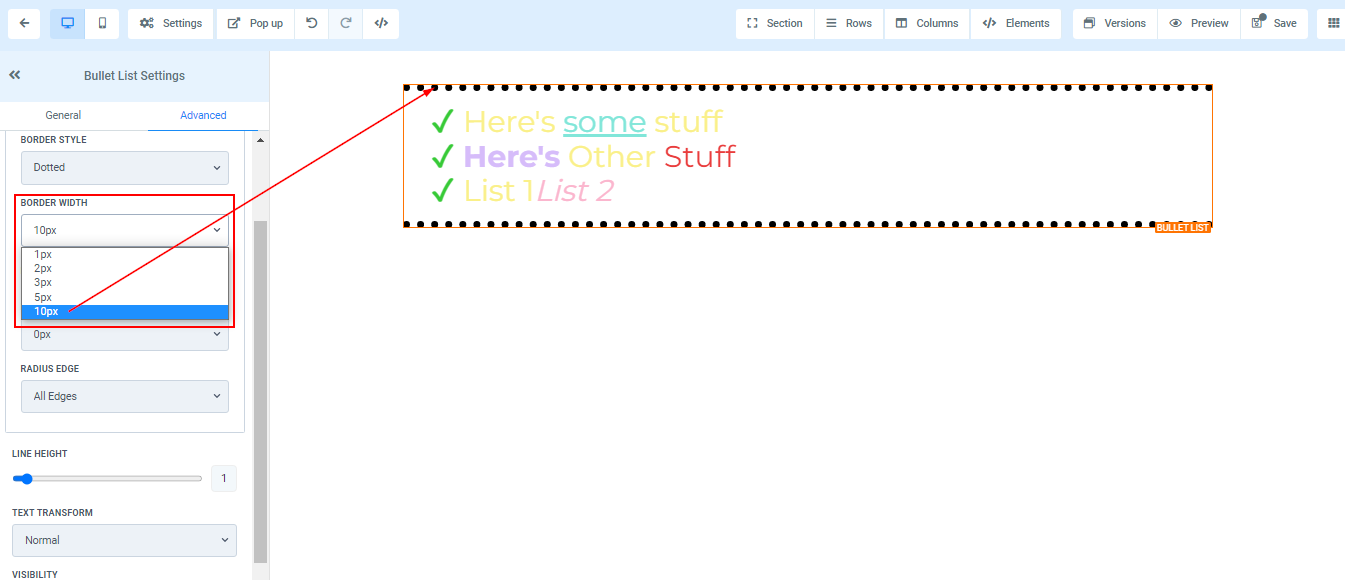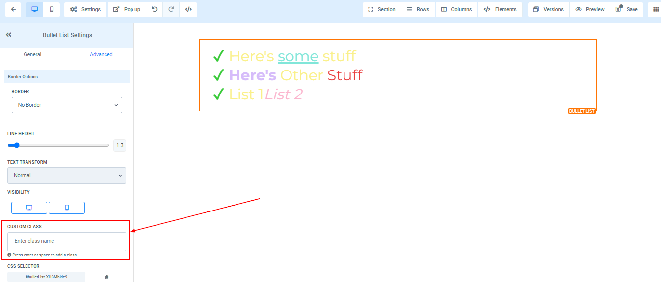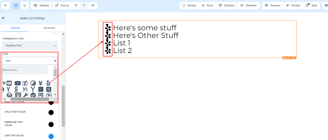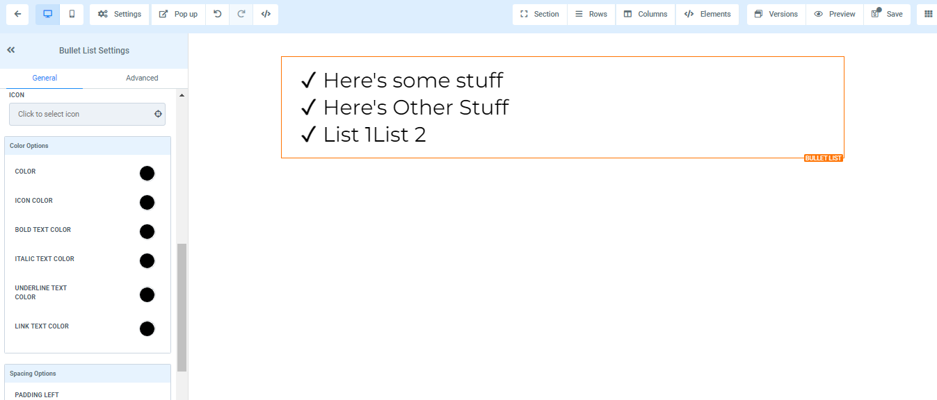 To add a Bullet list to your page, simply drag and drop the bullet list in the editor’s space to manage the settings.