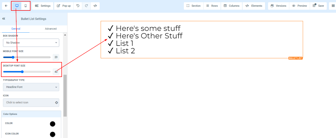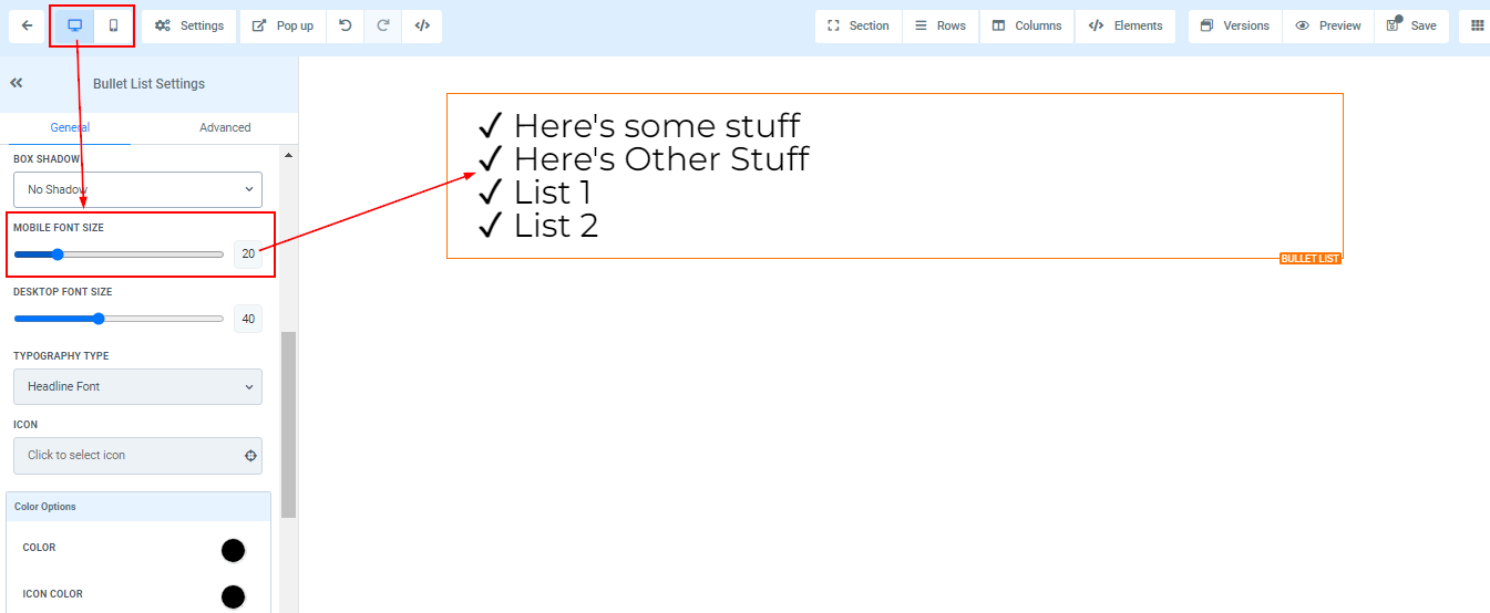 You can adjust the mobile and desktop font sizes of a particular text/content simply by adjusting the size bars.