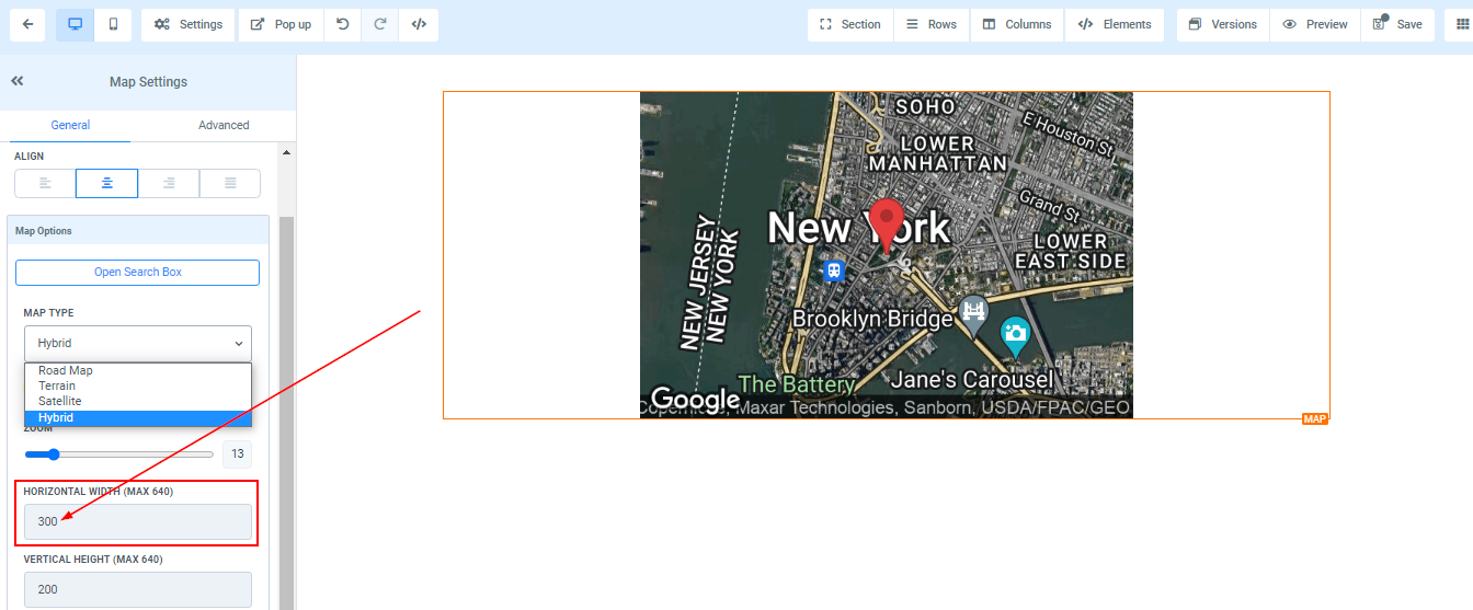 You can adjust the height and width of your map by inputting the size number you want. The maximum height and width you can go are 640.