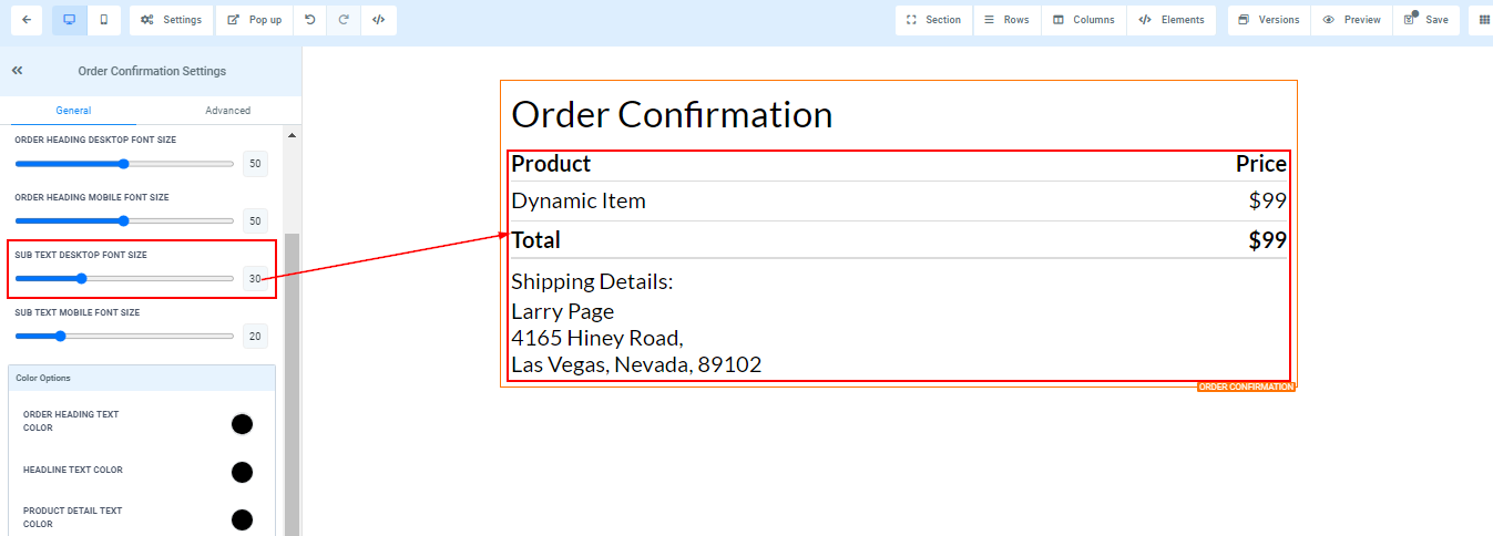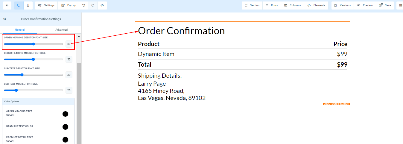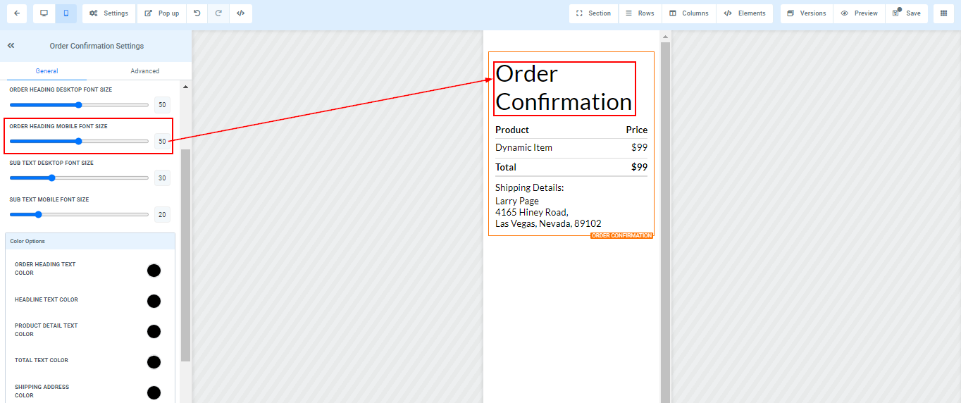You can adjust the mobile and desktop font sizes of your order heading by adjusting the size bars.