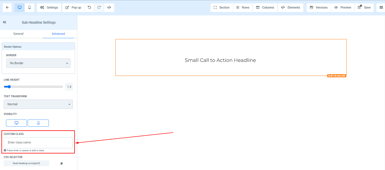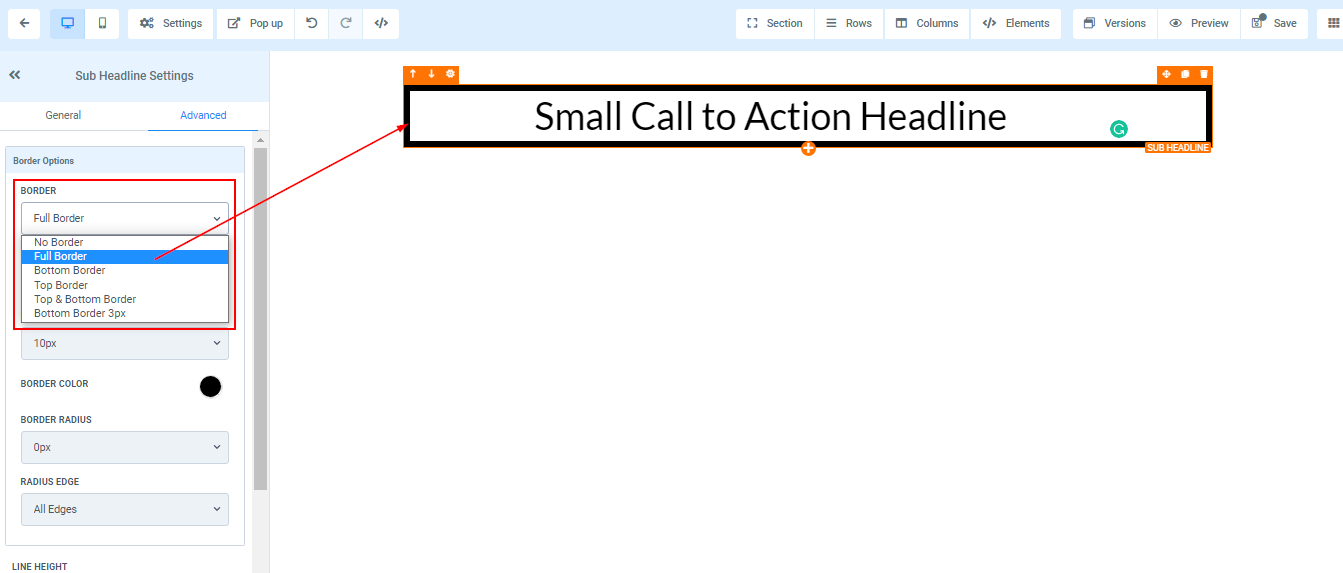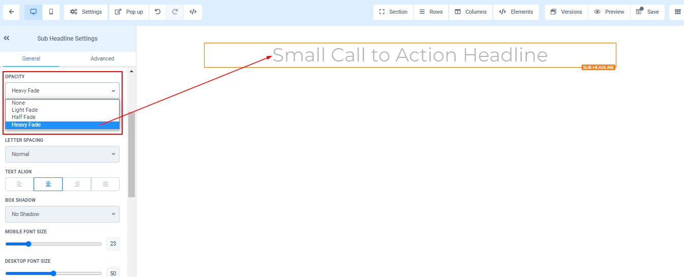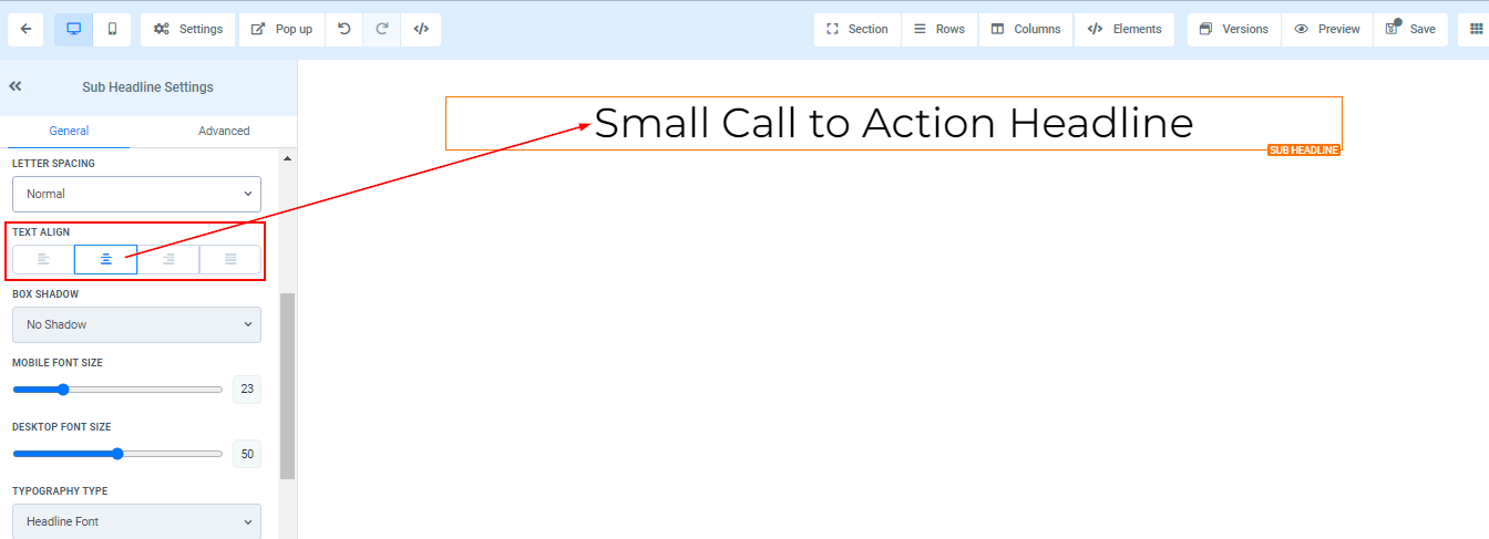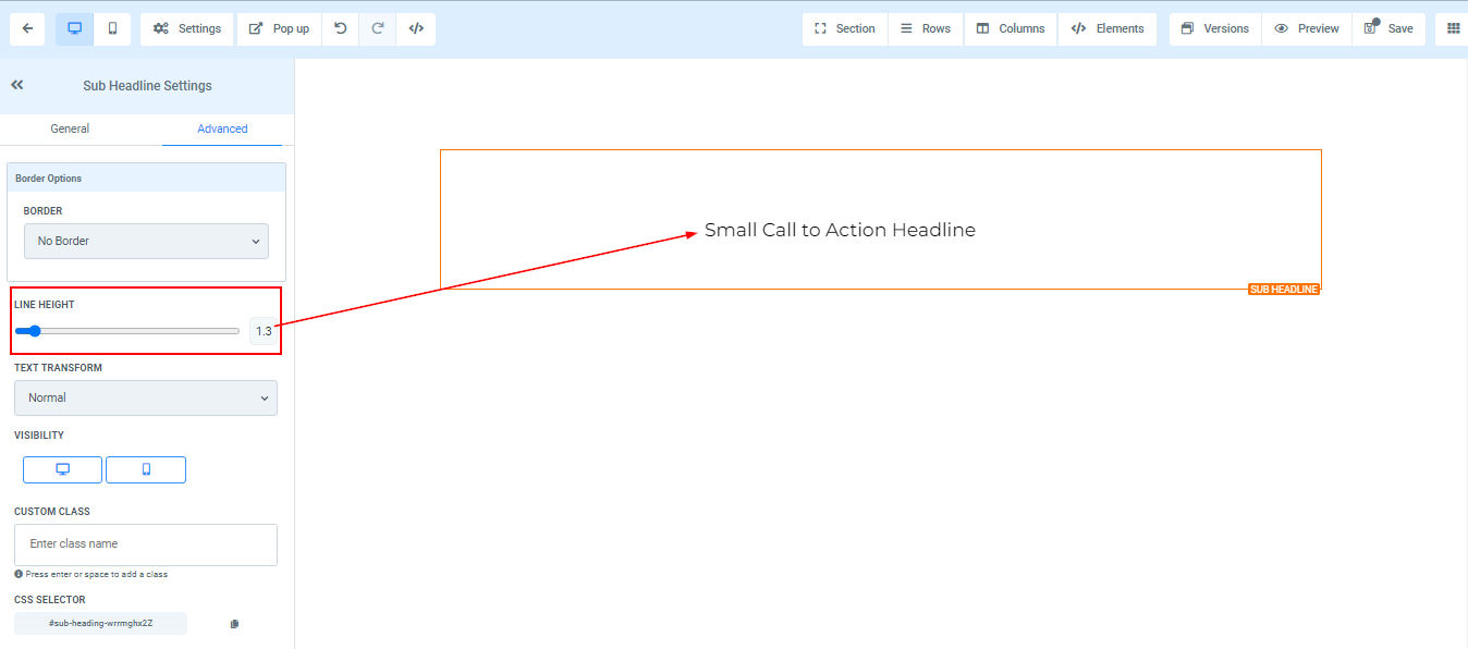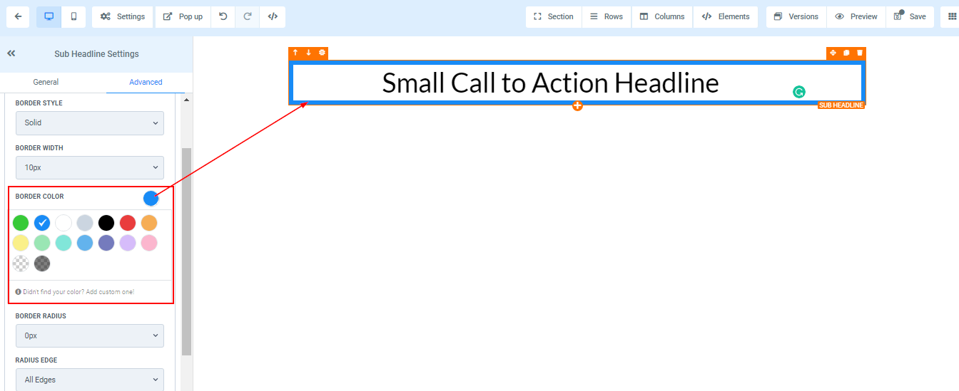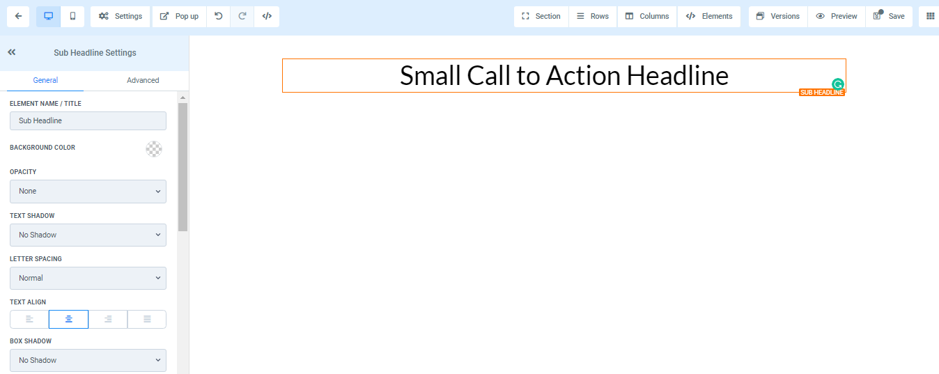 To add a sub-headline, drag and drop the Sub-headline in the editor’s space to manage the settings.