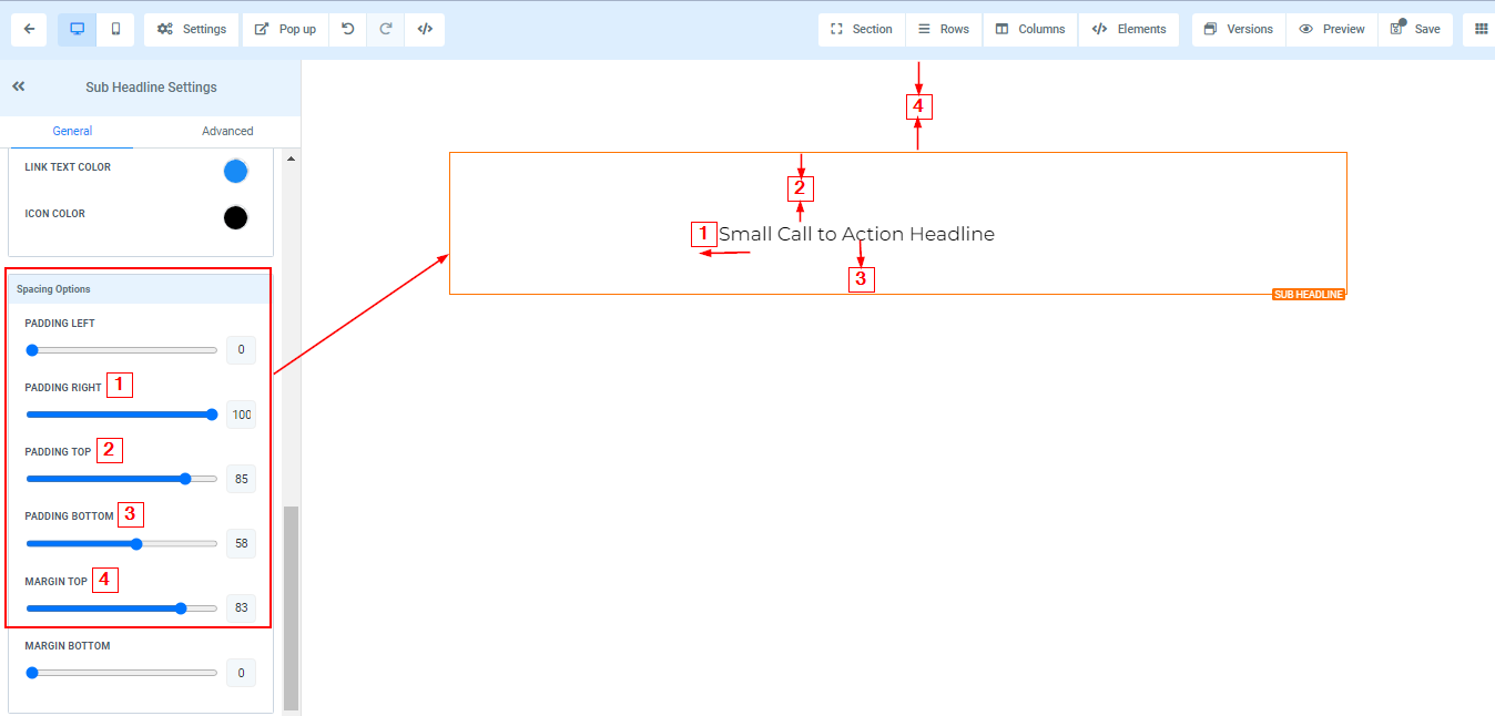 There are different spacing options available for adjusting your content. Depending on the Edit option you are working on, the settings will only be applicable to that option. For example, if you are editing a particular Row (the BLUE box), only every content in that Row will follow the command of what settings you make.