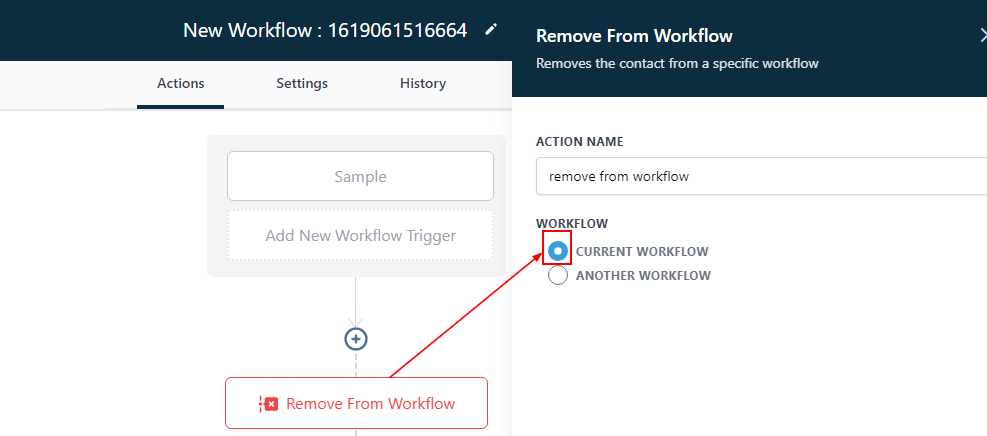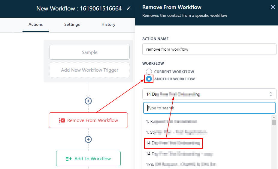 When you toggle on the “Another workflow”, It allows you to remove a contact by selecting from all workflows the particular workflow you want to remove the contact from.