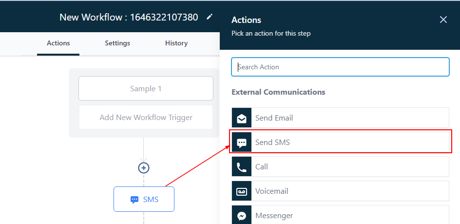 Workflow – External Communication Action: This action sends a text message to the contact.