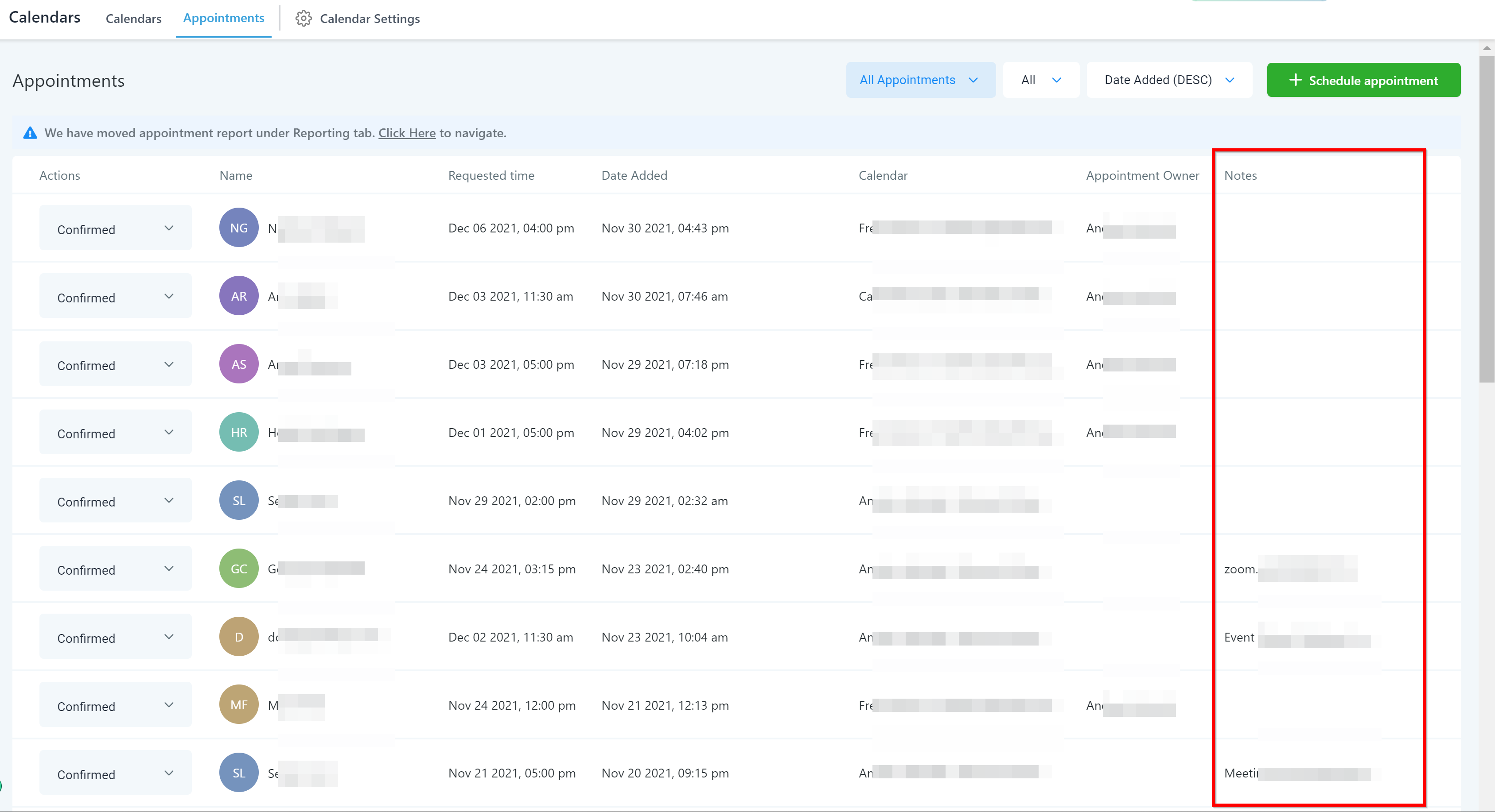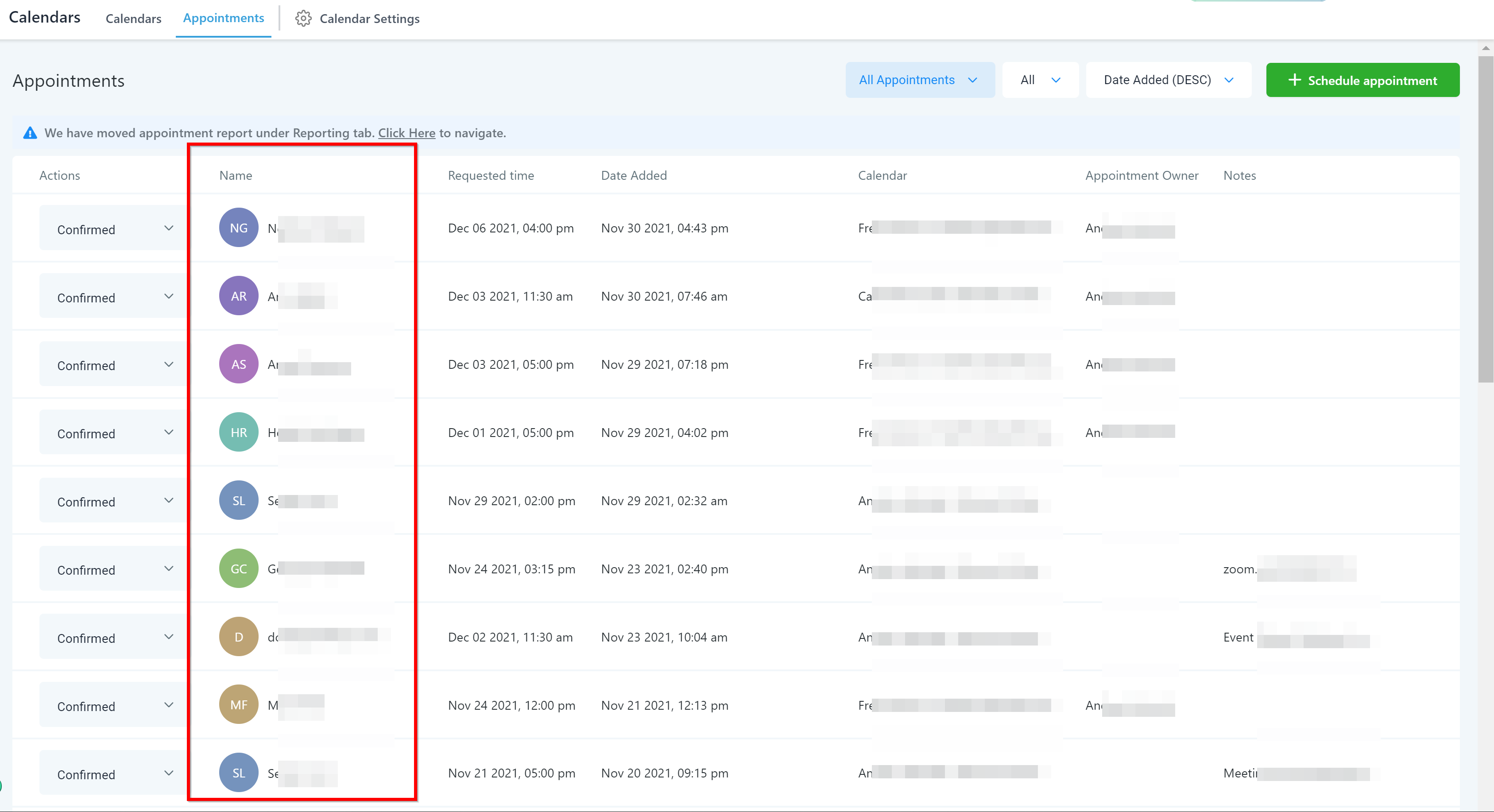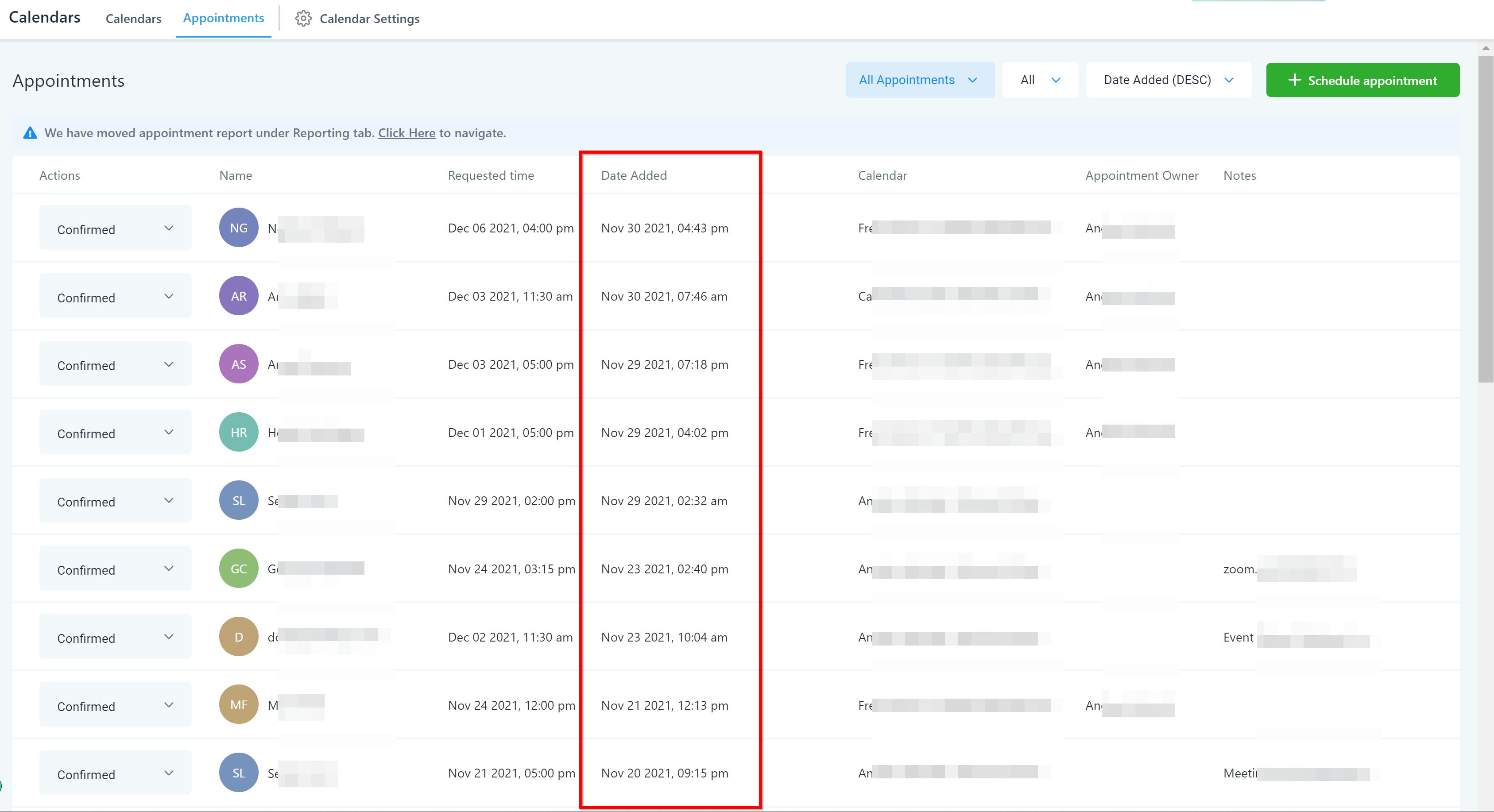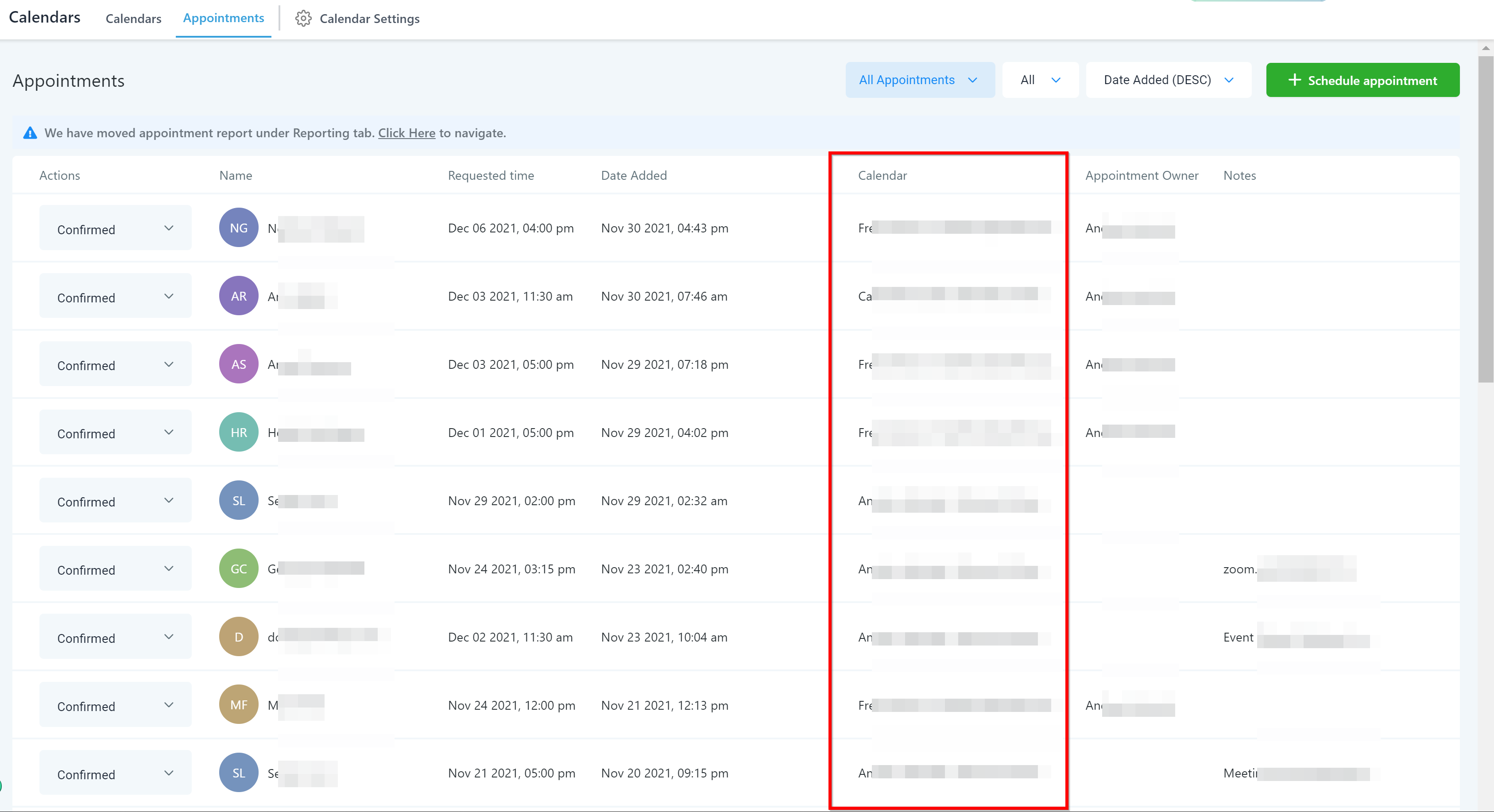 In this column, you can see which calendar was used to book the appointment.