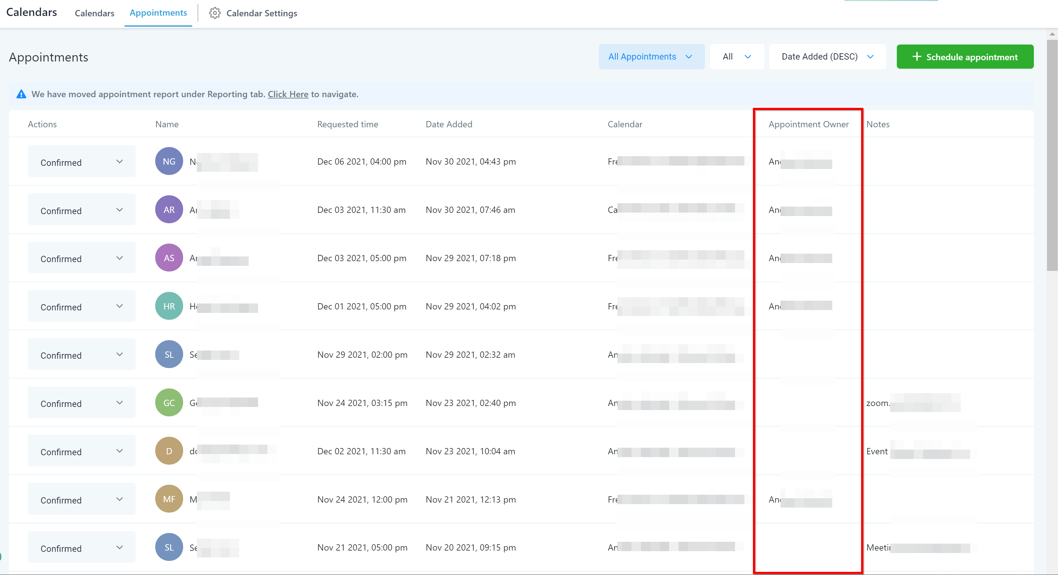 In this column, you can see the owner of the appointment. This is something that sales teams use when dividing new appointments up between a team of multiple sales agents.