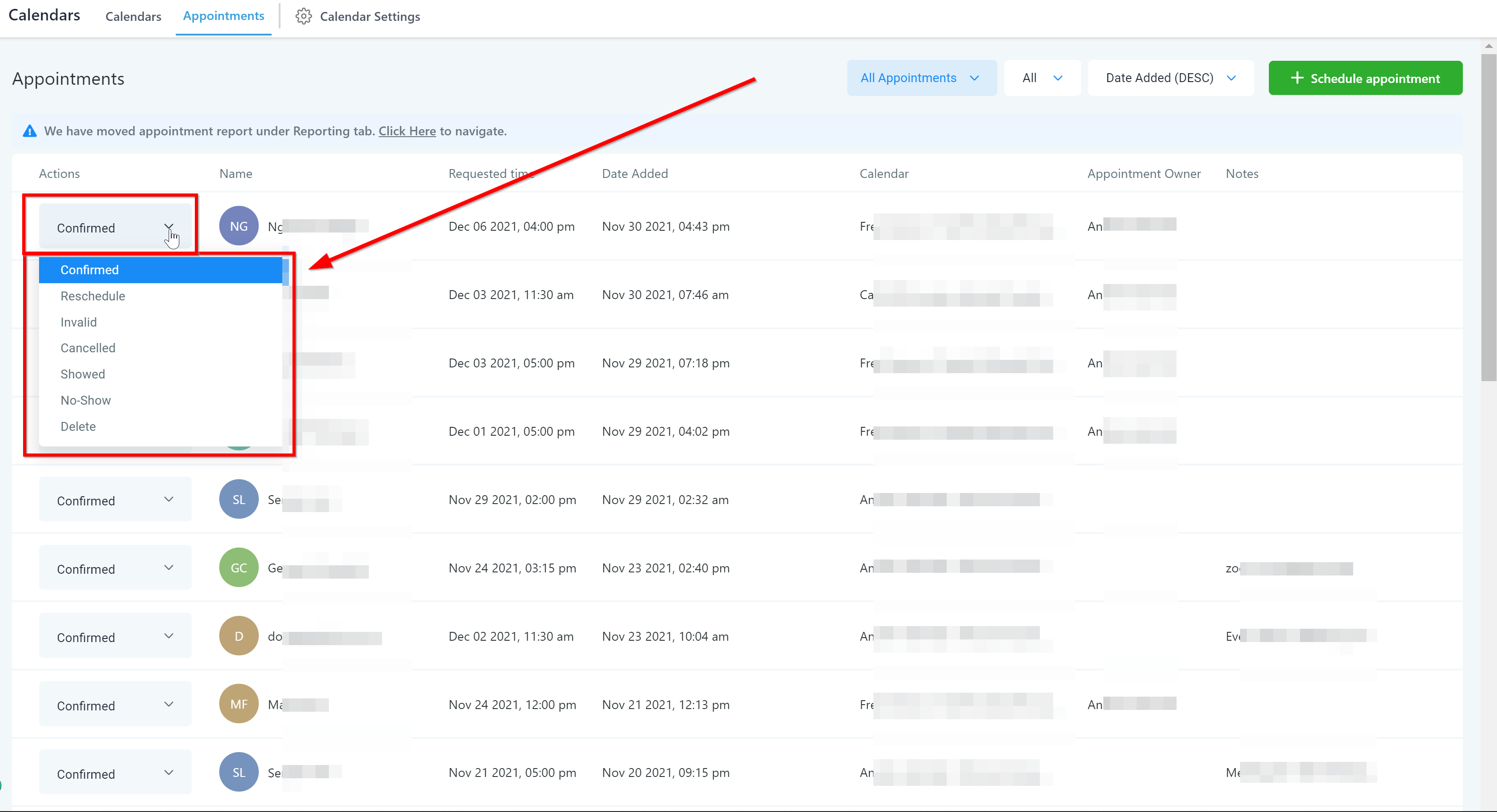 In this column, you can filter the appointments by different appointment statuses such as “Confirmed, Cancelled, or New”.