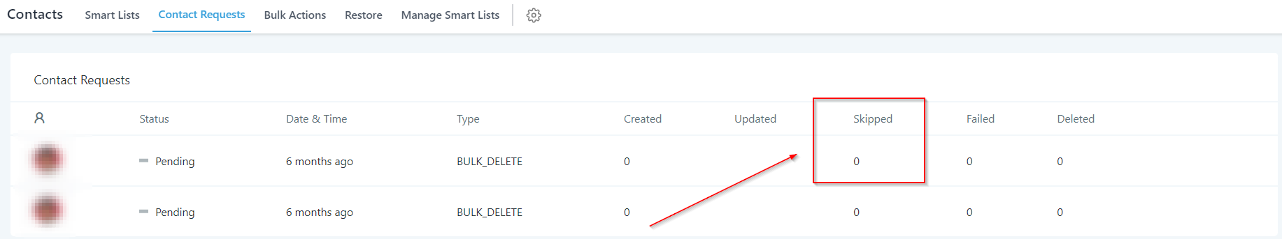 Gives you the information about the number of contacts skipped while performing the operation.