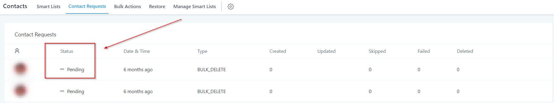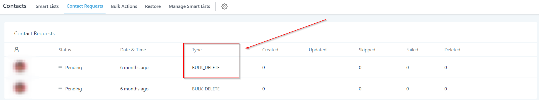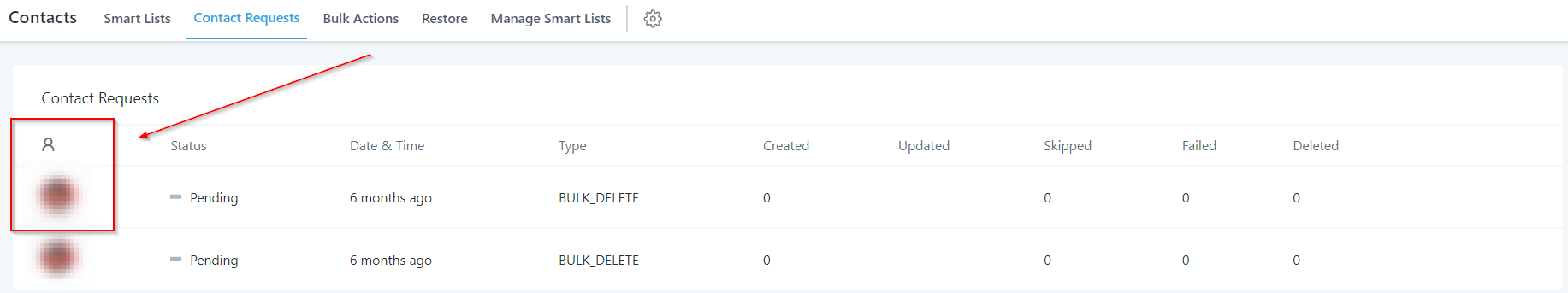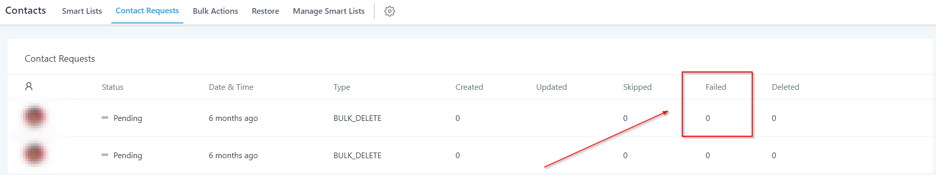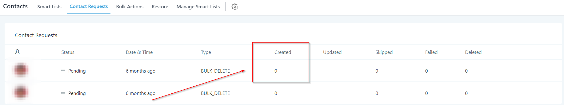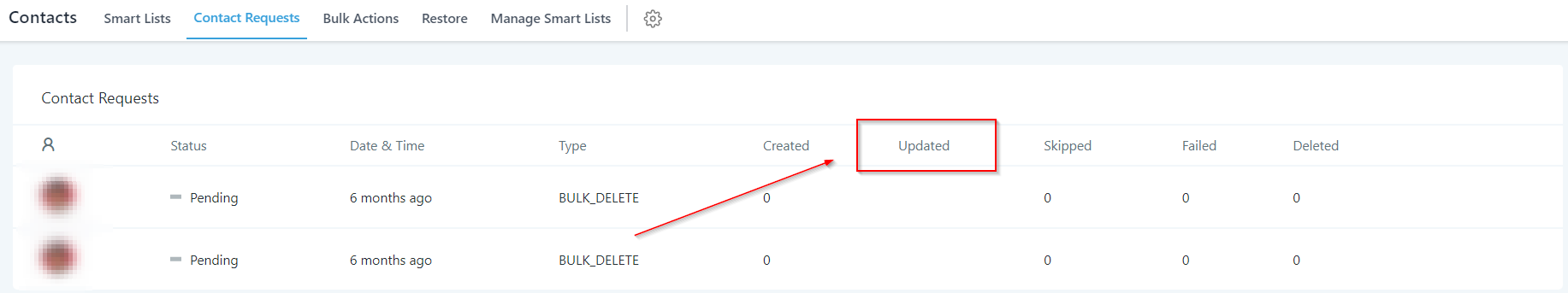 Gives you the information about the number of contacts updated through each request shown in the list.