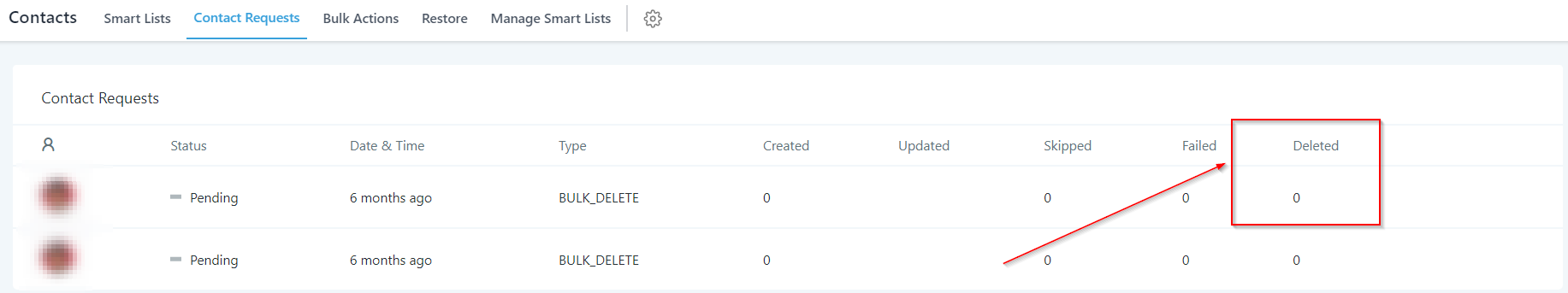 Gives you the information about the number of contacts deleted.