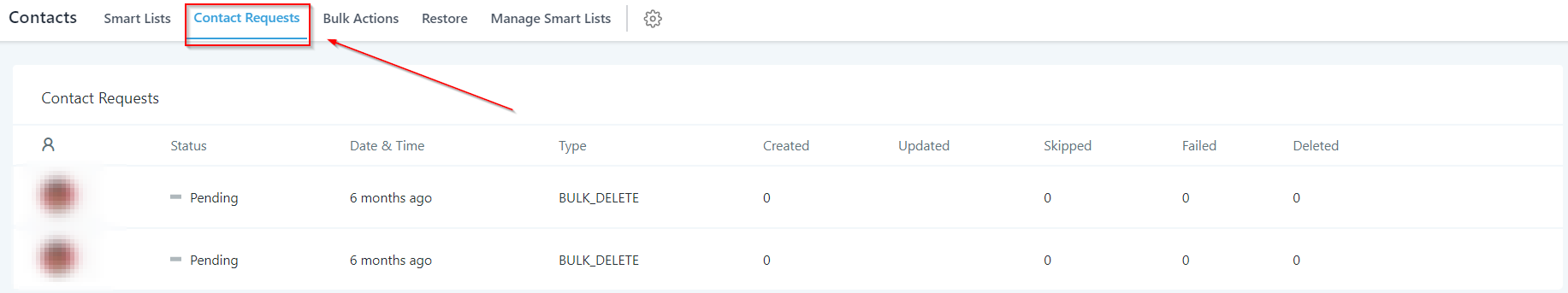 Gives you information about the contact requests pushed and the stats associated with each contact request.