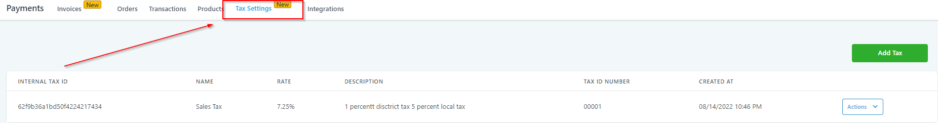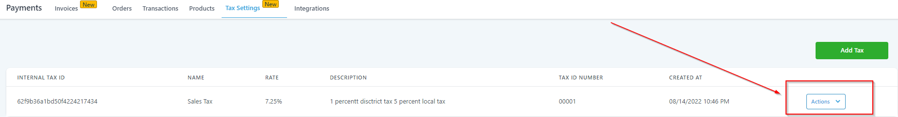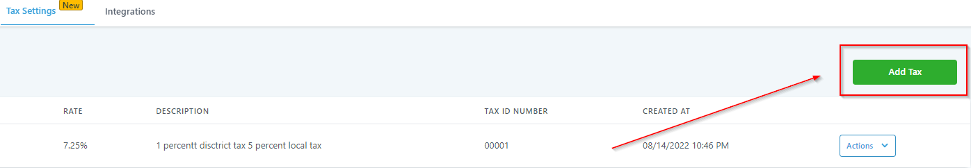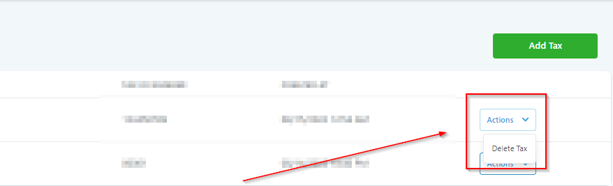 Use this tab to delete one of the tax you have created. Go to an Action menu of the tax to find “Delete” option which will allow you to delete a specific Tax from the list of Taxes you have created inside of your CRM. This will only delete one Tax at a time so all of the other Tax from the list will not get affected if you click “Delete’ on one of the Tax from the list.
