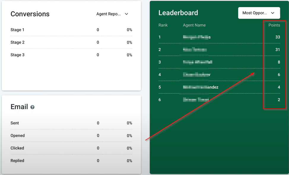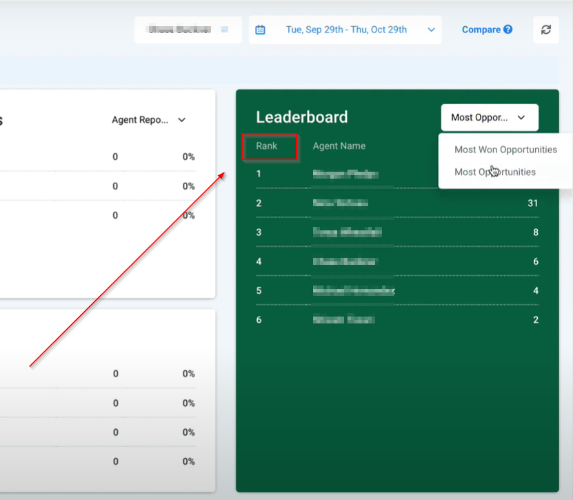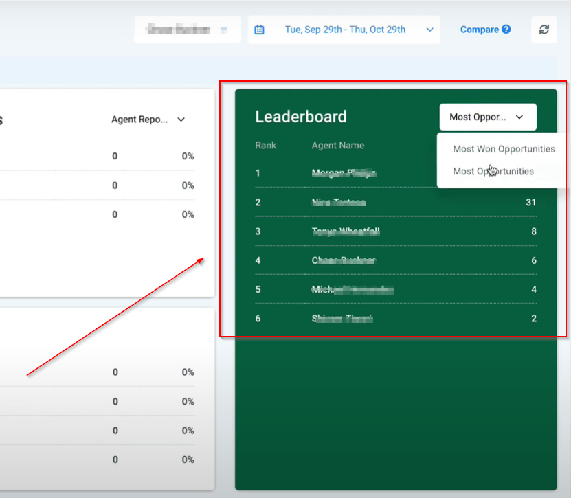 This tab will allow you to filter the agents who either own most of the opportunities or agents who have won most of the opportunities. When selected “Most Won Opportunities” you will see the top agent who won most opportunities.