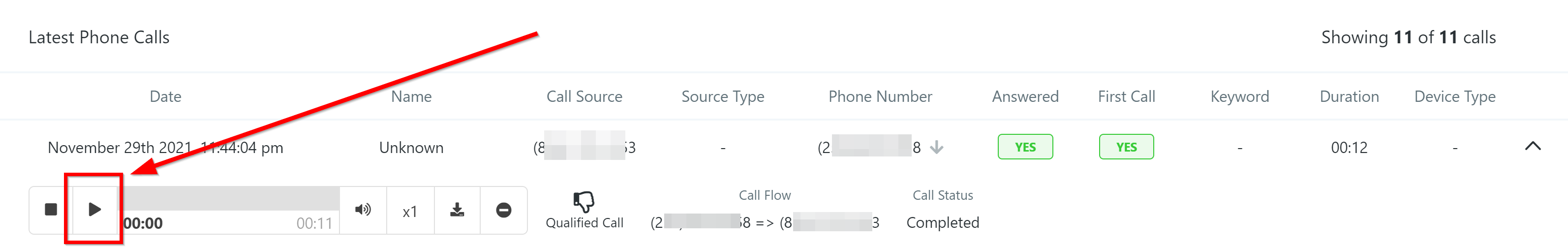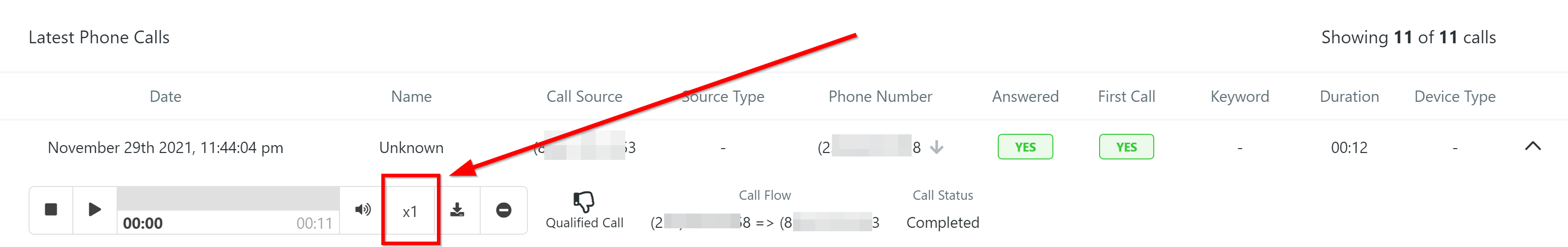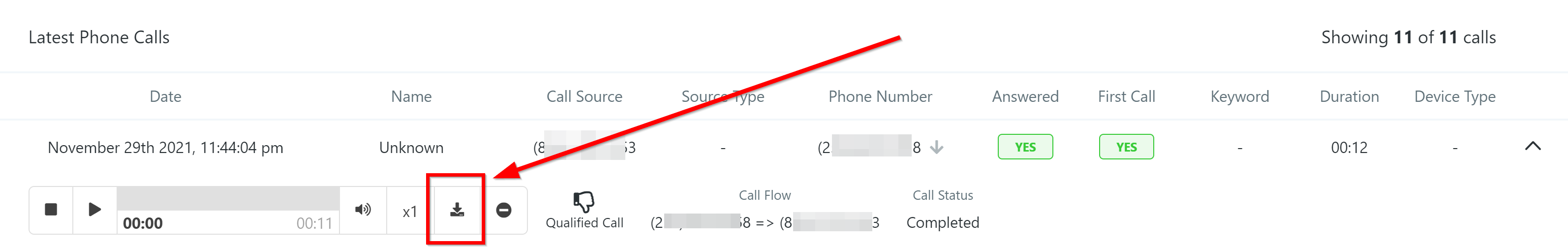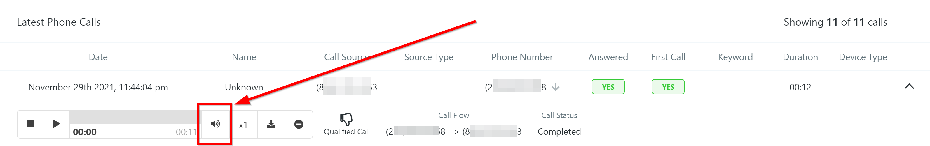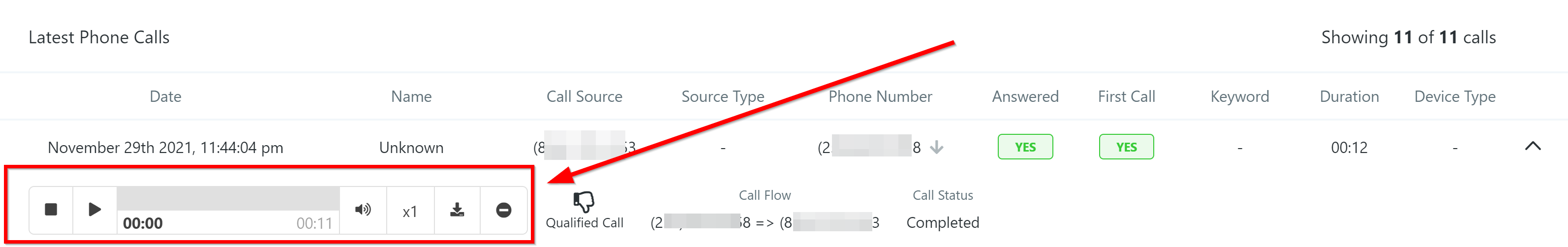 Click here to open the call details. If you are recording phone calls, you will also have multiple actions to take using the recorded call.