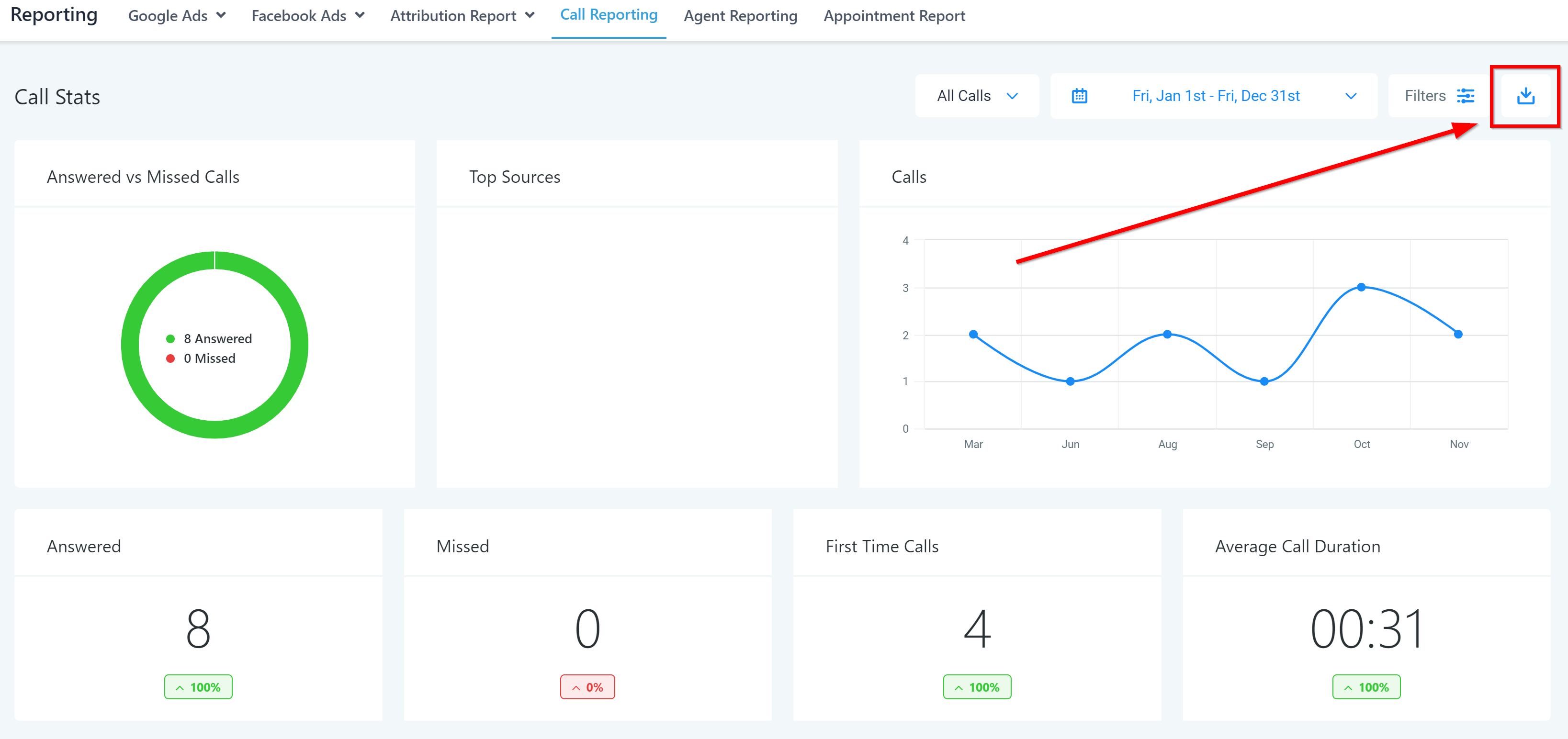 By clicking this button, you can filter the data that appears below to get more accurate and specific information regarding your call reports. To learn how to filter call reporting, click here: Advanced Call Reporting Filters