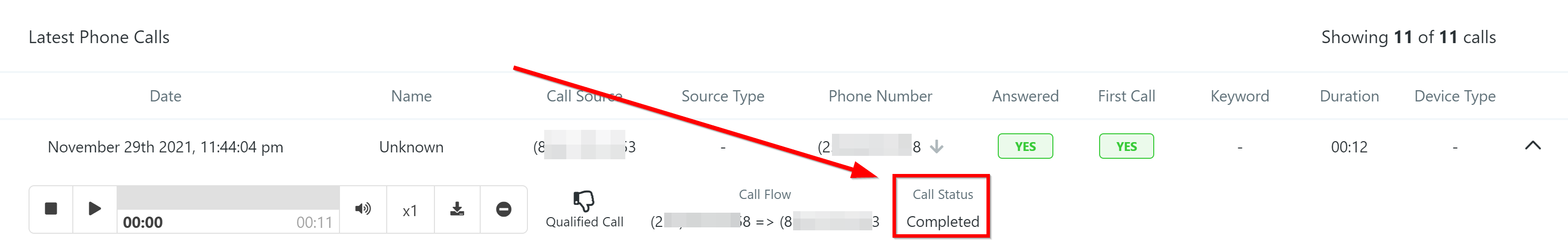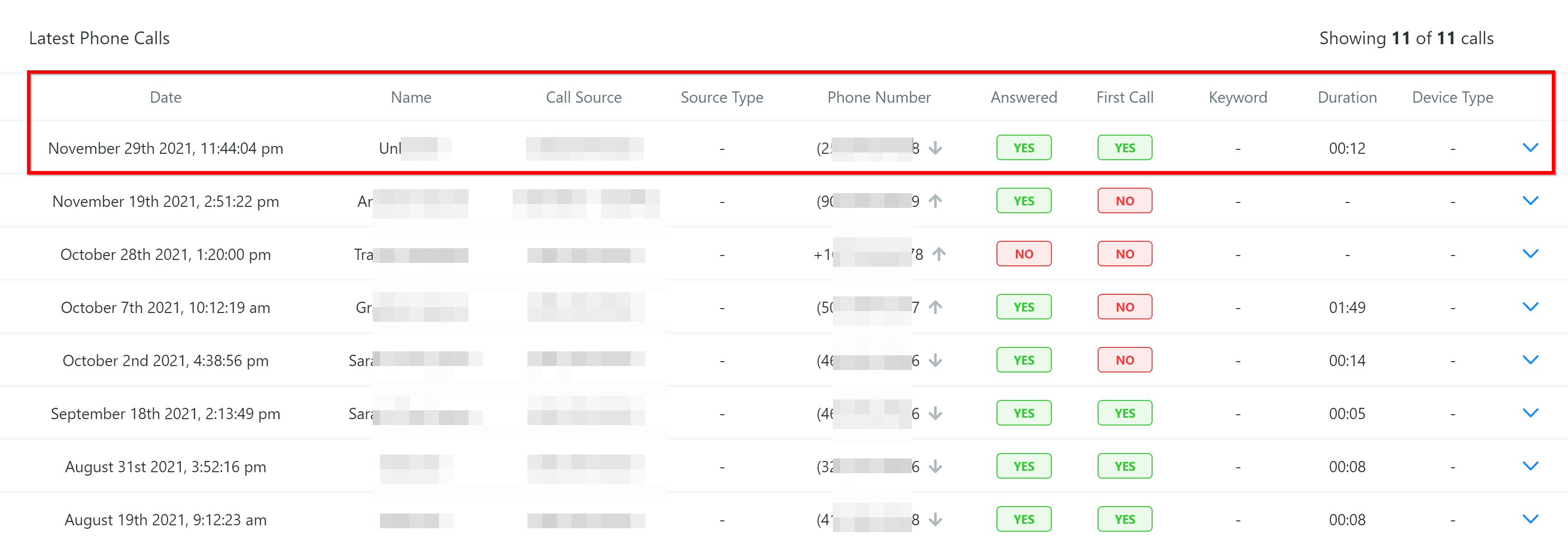 This table shows you a list of recent phone calls and all the associated data that is collected including: