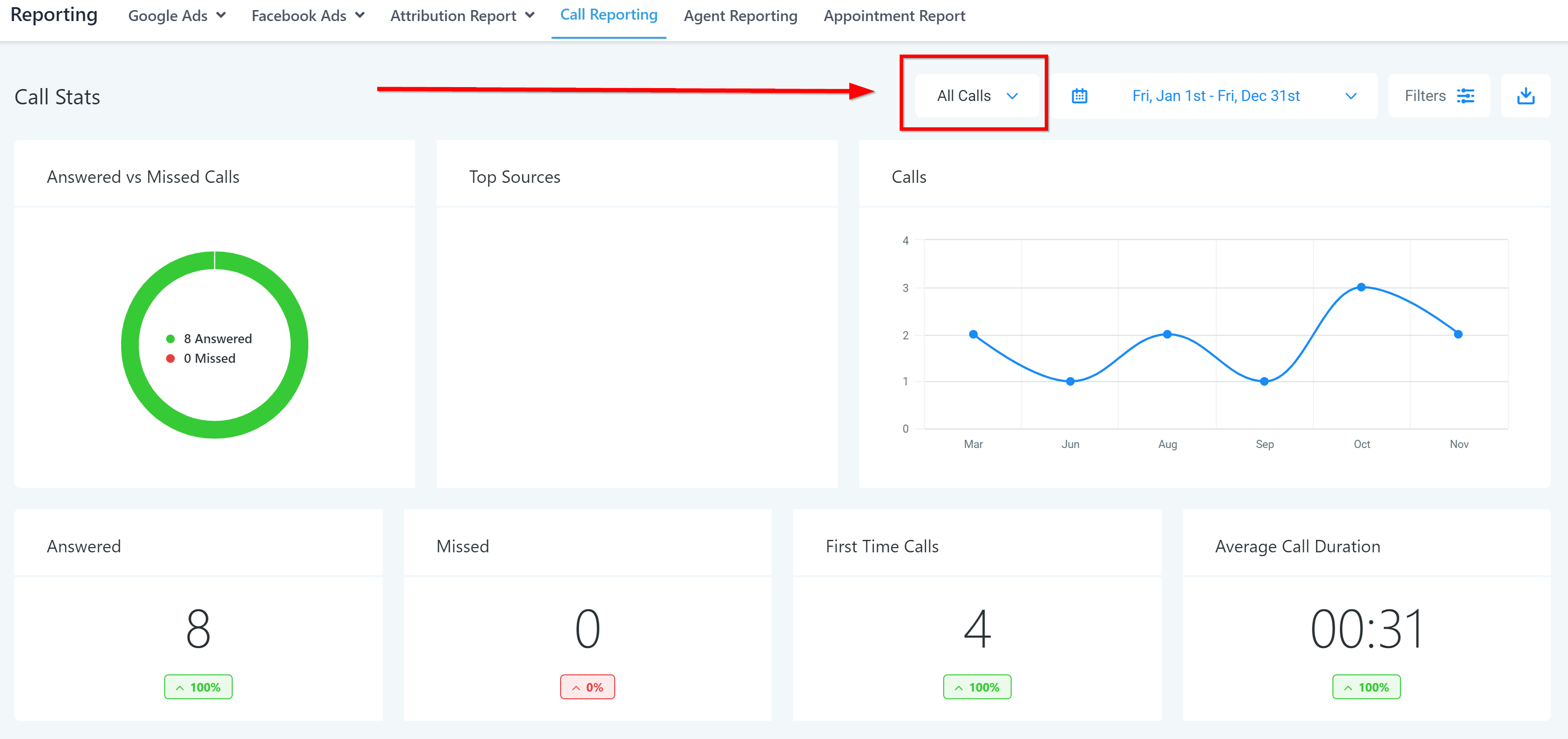 If your business has more than one phone number integrated into your CRM, you can switch between them individually or analyze all numbers at the same time.