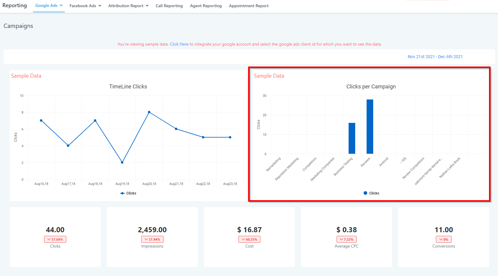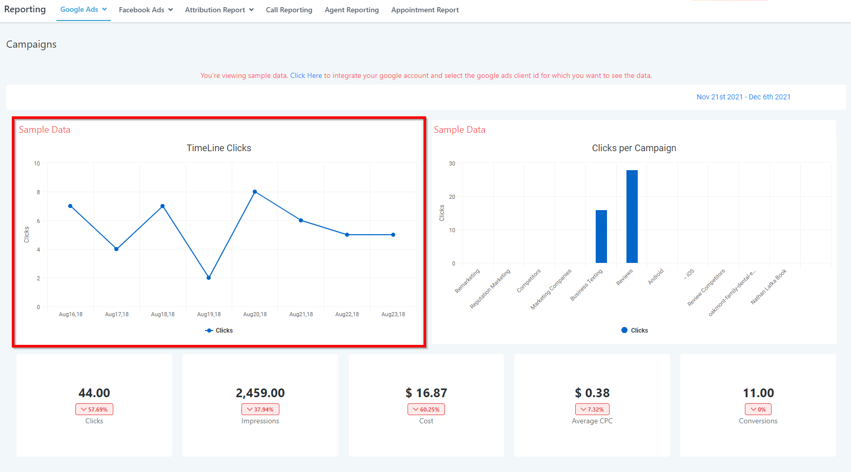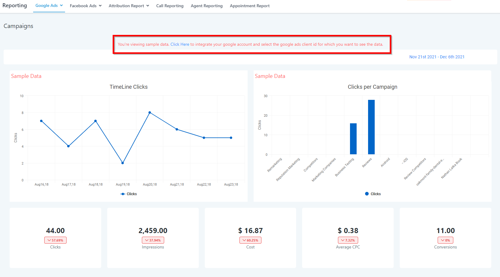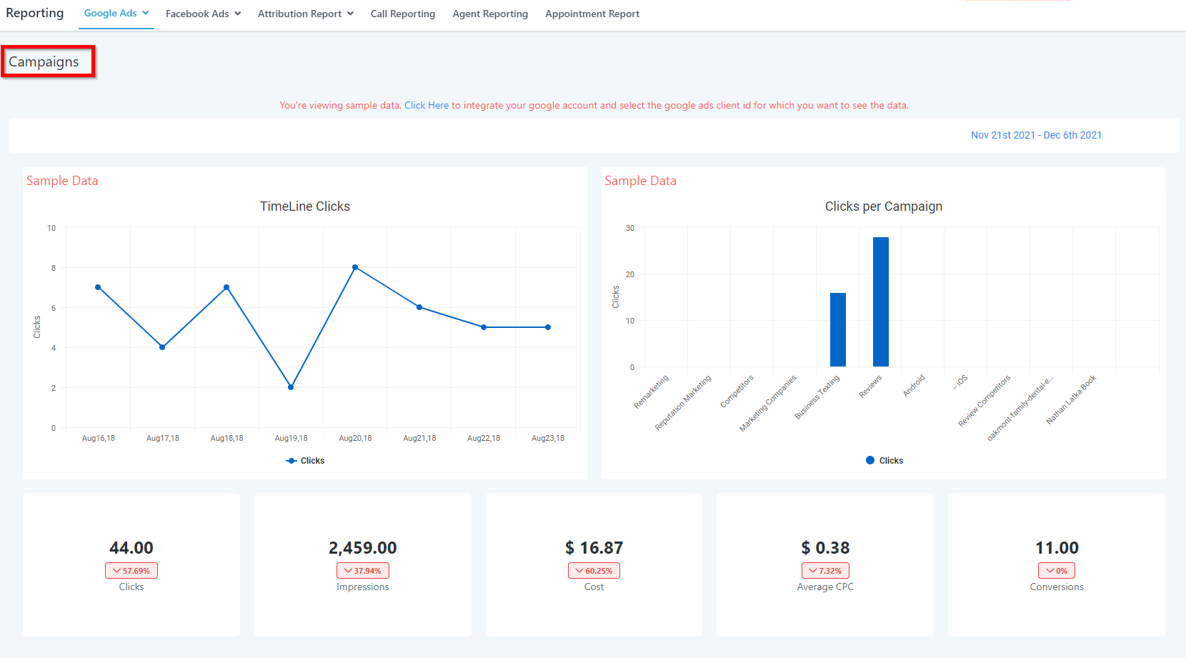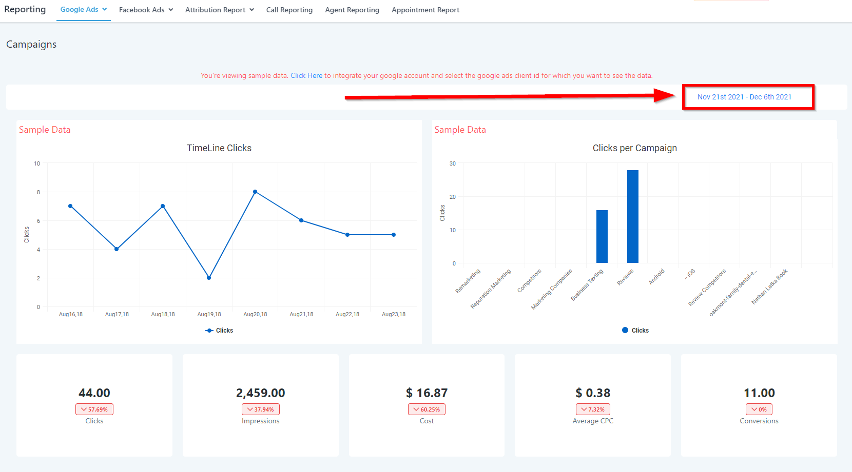You are currently looking at sample data. In order to see your Google Ads data, you need to integrate your Google account and sync your Ads data.
