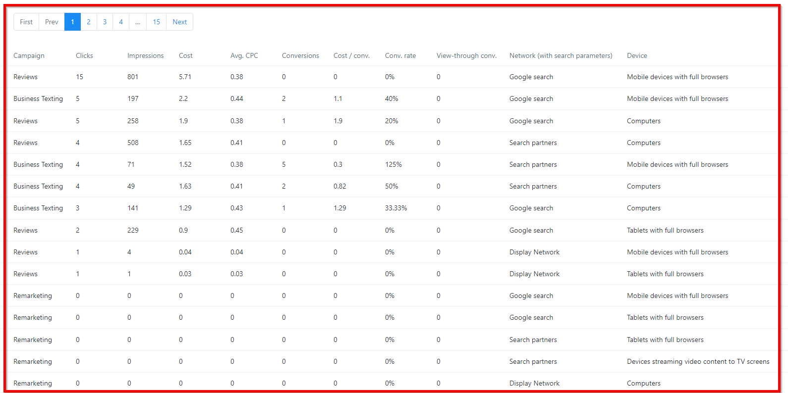 Here you will see a full table with all data at the keyword level. This is perfect when needing to compare how certain keywords are performing against others.