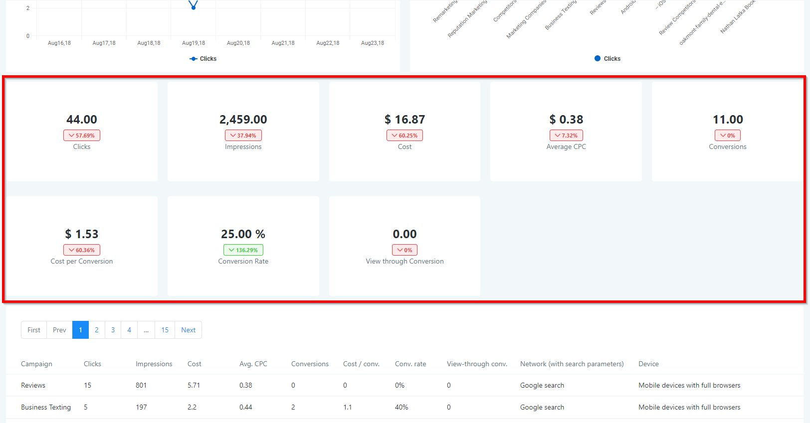 Here you will see individual cards showing your data at the campaign level, as well as the percentage they have increased or decreased over a certain period of time.