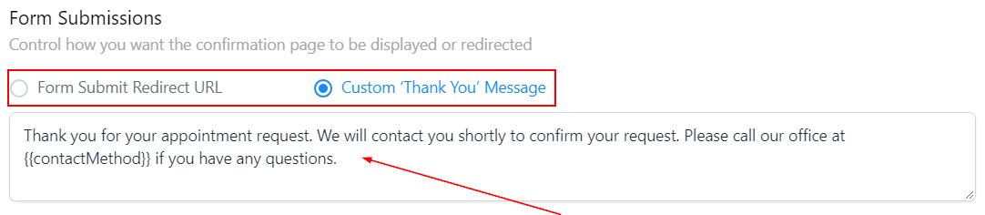 Here you can choose what happens when your calendar form is complete. You can either choose to show the person a custom thank you message or you can redirect the person to a webpage of your choice.