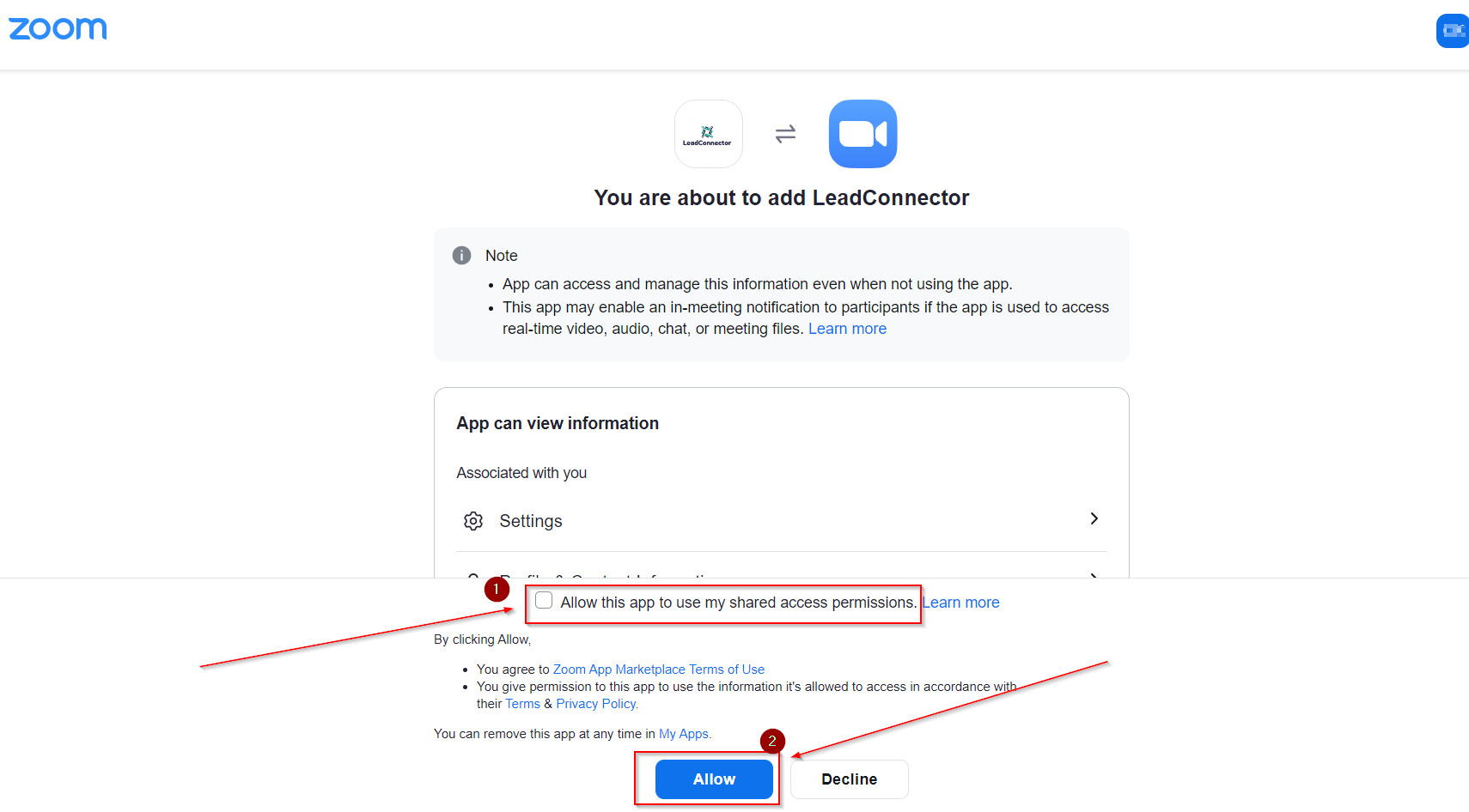 Zoom Meetings Estimated reading: 1 minute 1469 views Connecting zoom accountClicking on connect tab will initiate the process of connecting your zoom account to your CRM. You will be taken to the zoom sign-in page for this. Sign in to Zoom1. Enter your username.2. Enter your Password.3. Click on “Log In”. Enable App Approval1. Turn the toggle on. Once done, you will be asked to confirm your selection. 2. Clicking on the “Enable” tab will allow Leadconnector to access your zoom information. Permission to access zoom account1. Check the box,2. Click on allow.