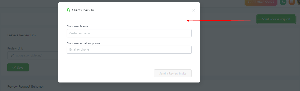 Once you click the “Send Review Request” button, you’ll need to input the contact’s information. You will need to add their name, and either a valid email address or phone number to send the review request.