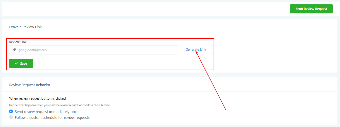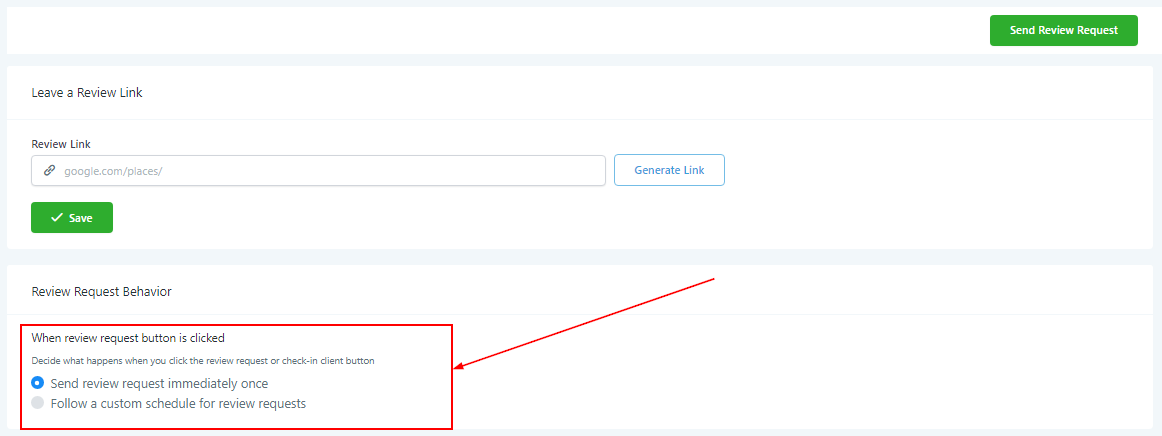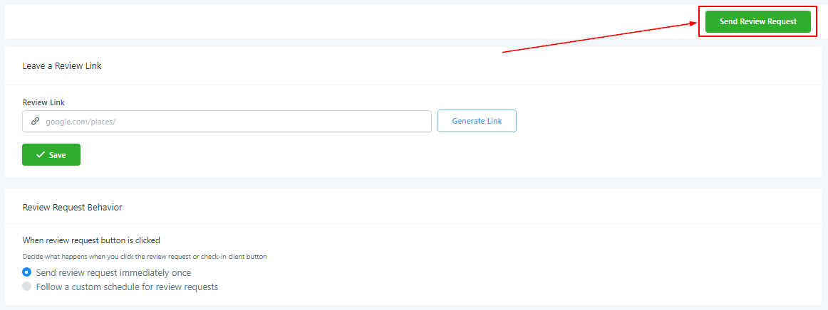 Decide what happens when you click the review request or check-in client button. You can either send the review request immediately and once or on a custom schedule.