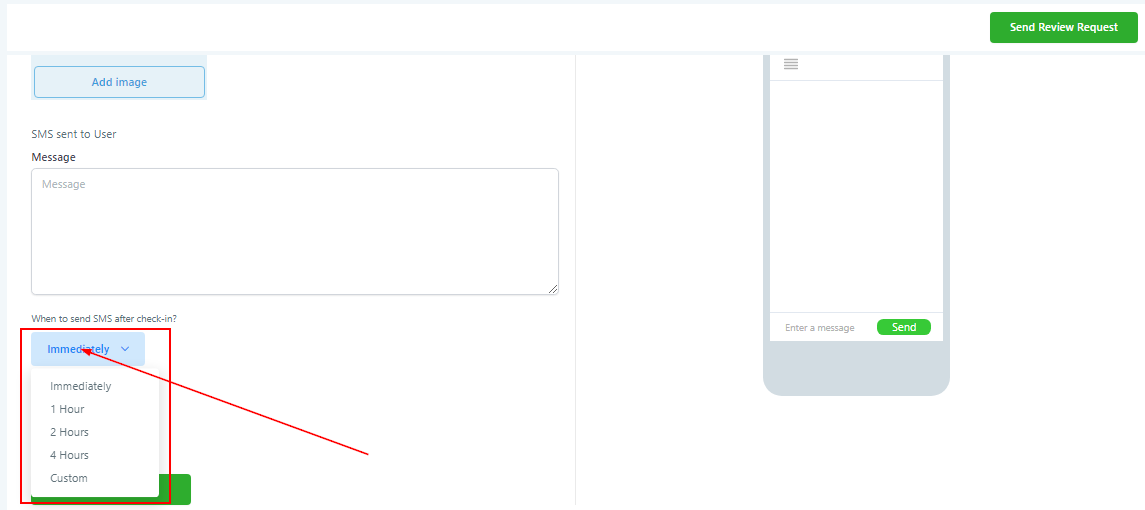 Choose when to send this SMS/Email after your customer “checks in”. You have a few pre-defined options, you can either send the message immediately, in listed hours or you can choose “custom” to set your own timeframe.