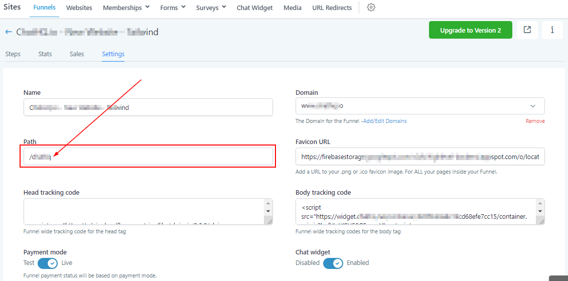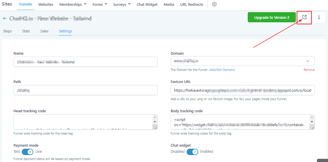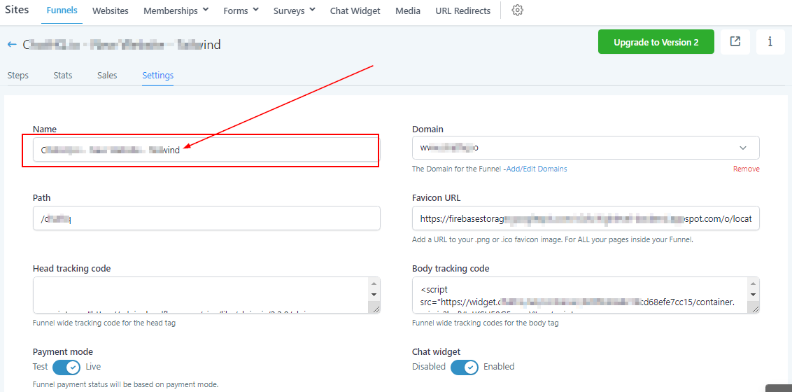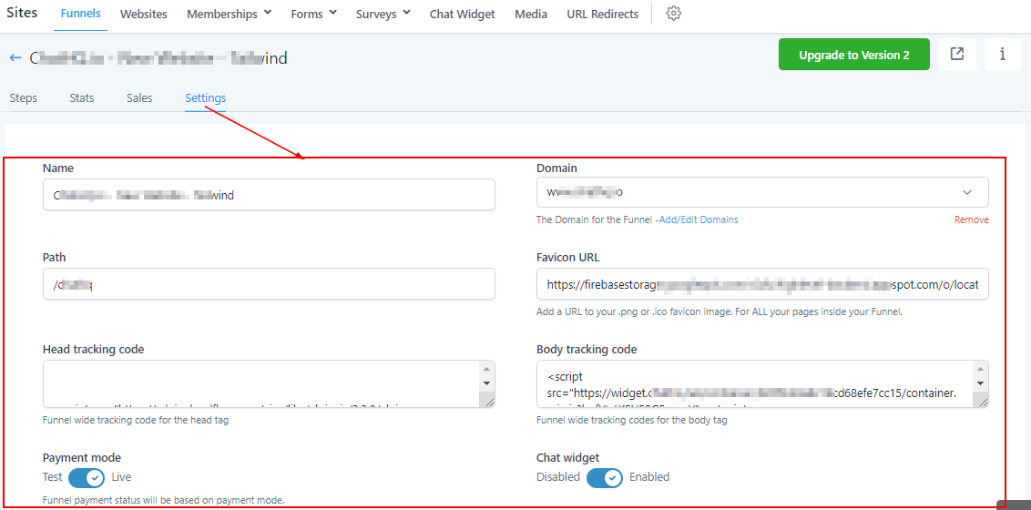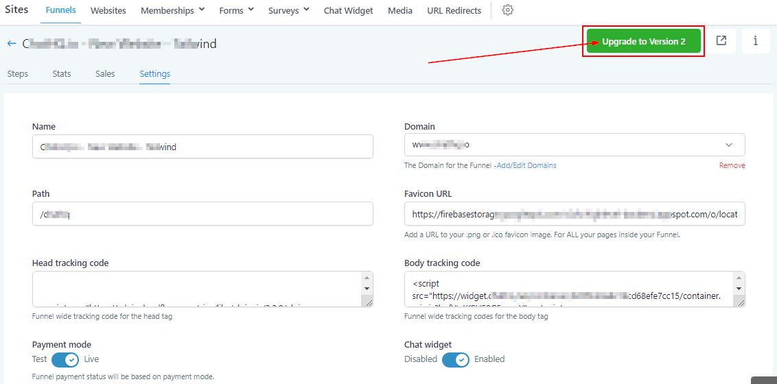If you want to upgrade from funnel version 1 to version 2, click on this ” upgrade to version 2″ button.