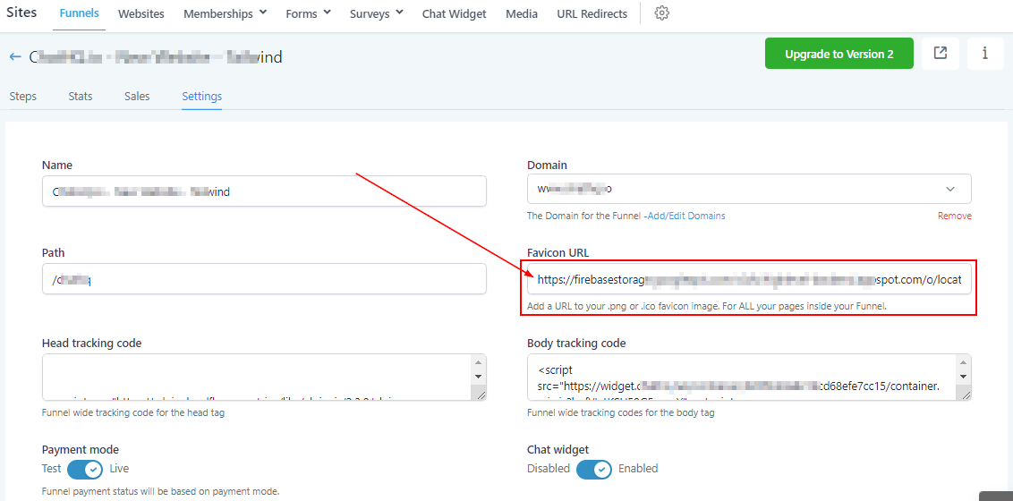 To add Favicon to your funnel, you can paste the favicon URL in the provided field box. This will automatically add a URL to your .png or .ico favicon image for ALL your pages inside your Funnel.