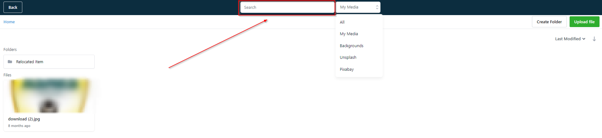 Media Estimated reading: 2 minutes 1398 views Here you can manage the media files in your CRM. Clicking on the ‘Media’ tab under ‘Sites’ section will take you to the sub section in ‘Settings’ area of your CRM. Opening Media LibraryThis will take you to the Media Library of your CRM. Media Library HomeLets you organize your media . Searching MediaWith search tab you can locate media file from your CRM. All Media CategoriesYou can access additional media options through this tab. ArticlesMy Media Backgrounds Unsplash Pixabay