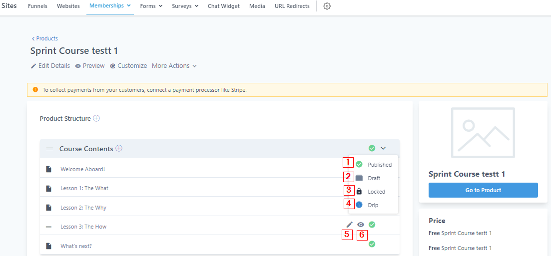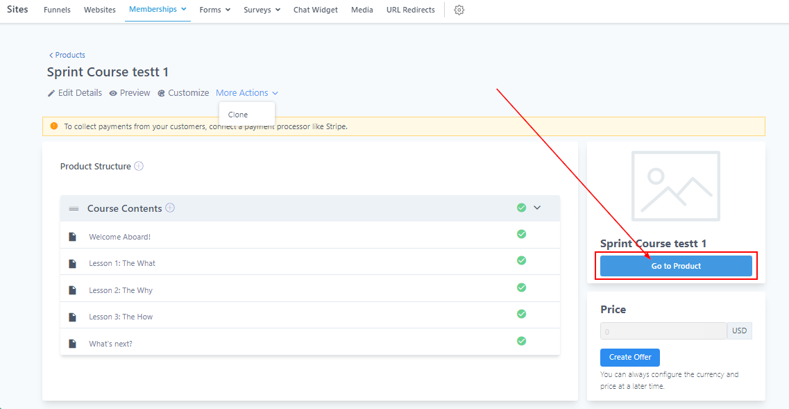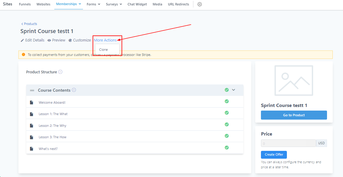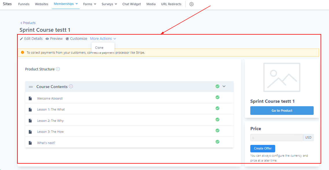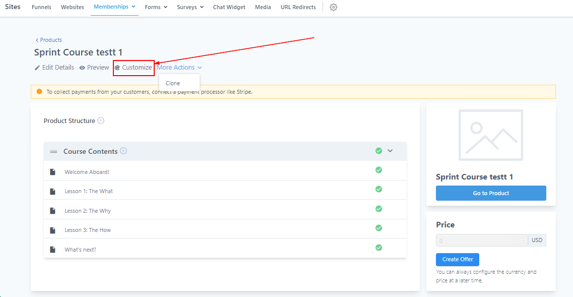 When you create the product course, it will appear as shown below. Here you can either edit, preview, customize, or clone this course. You can also set a price value for the course.