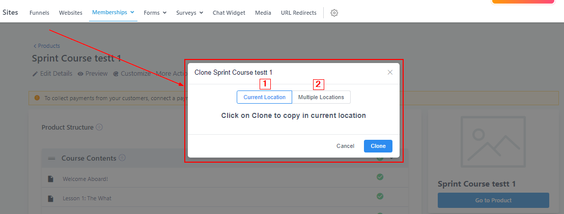Once you click on “Clone” this popup notification drops, You can either clone this course in this location (i.e this current CRM account you are working in) or multiple locations (i.e other account/sub-accounts within your CRM). Select the location you prefer and click “Clone”.