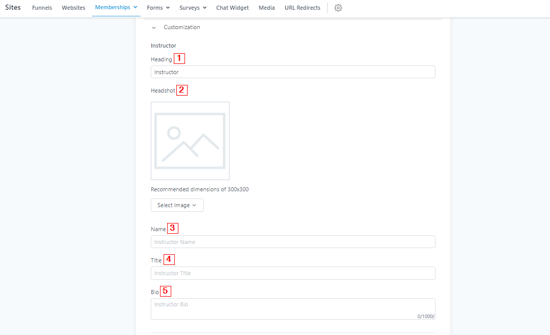 This image of the instructor will be displayed when your members view the course. The recommended dimensions is 300×300. To add an image, click on the “Select Image” button and upload a new file from your device. If you want to delete an uploaded image, You can click on “remove” on the right side of the “Select image” button.
