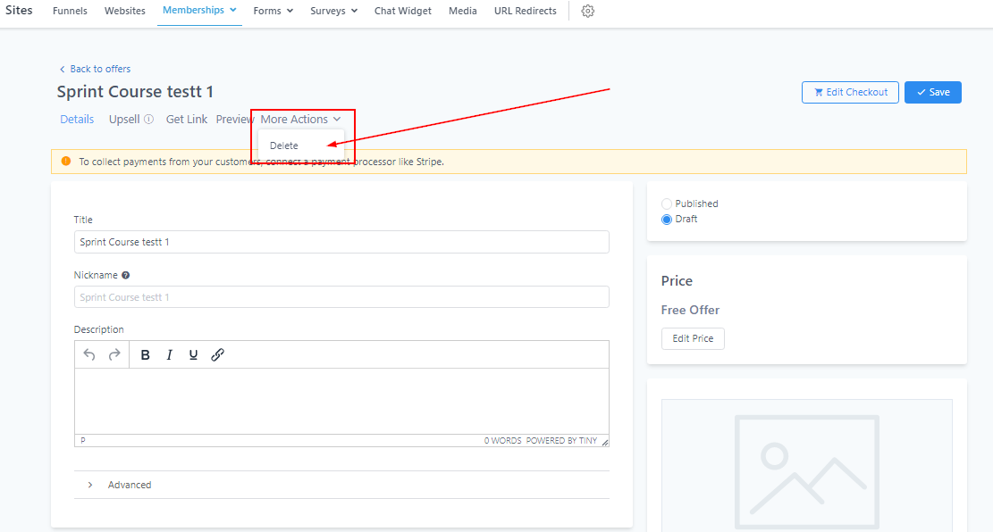 If you want to delete a course product offer, simply drop down the “More Action” menu and then click on the delete option.