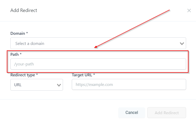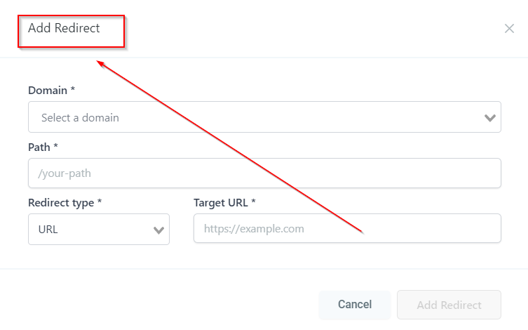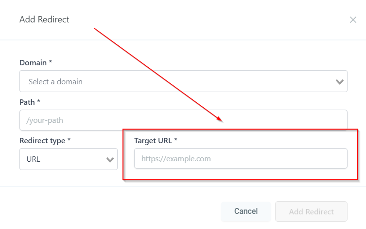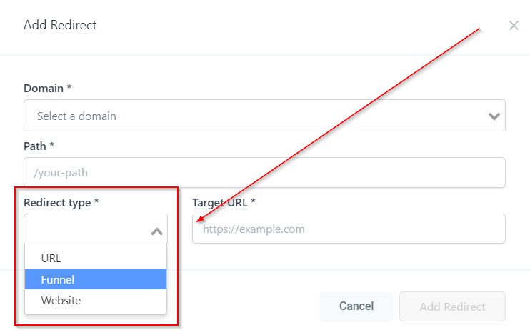 URL Redirects Estimated reading: 2 minutes 1265 views With URL redirects tool, you can redirect traffic from any URL on a Marketing OS hosted domain to any other URL. Adding a RedirectThis tab will take you to the “Add Redirect” page where you can setup URL redirection. Add RedirectLets you setup URL redirection. Selecting a DomainHere you will see the list of domains connected to your CRM location. Select the domain which you want to redirect. PathEnter the URL path that you are looking to redirect. Redirect TypeHere you can select the type of redirect such as Funnel, Website & URL. Target URLEnter the URL where you would like the existing domain’s URL redirected.